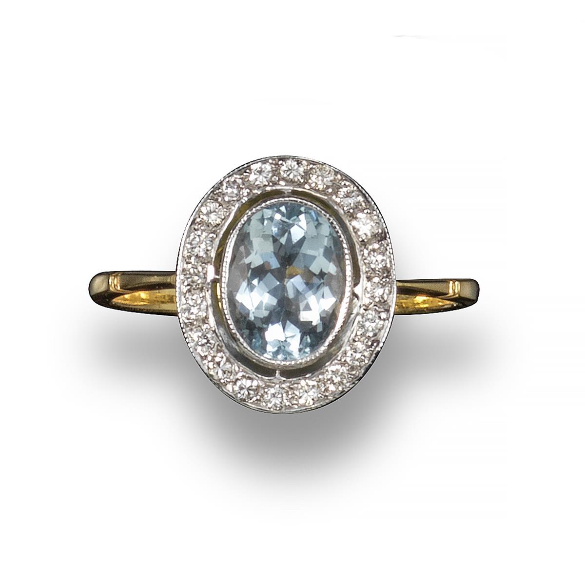 An aquamarine and diamond cluster ring, the oval-shaped aquamarine weighs approximately 1.10cts and is set within a surround of small round brilliant-cut diamonds in yellow and white gold, size O ½