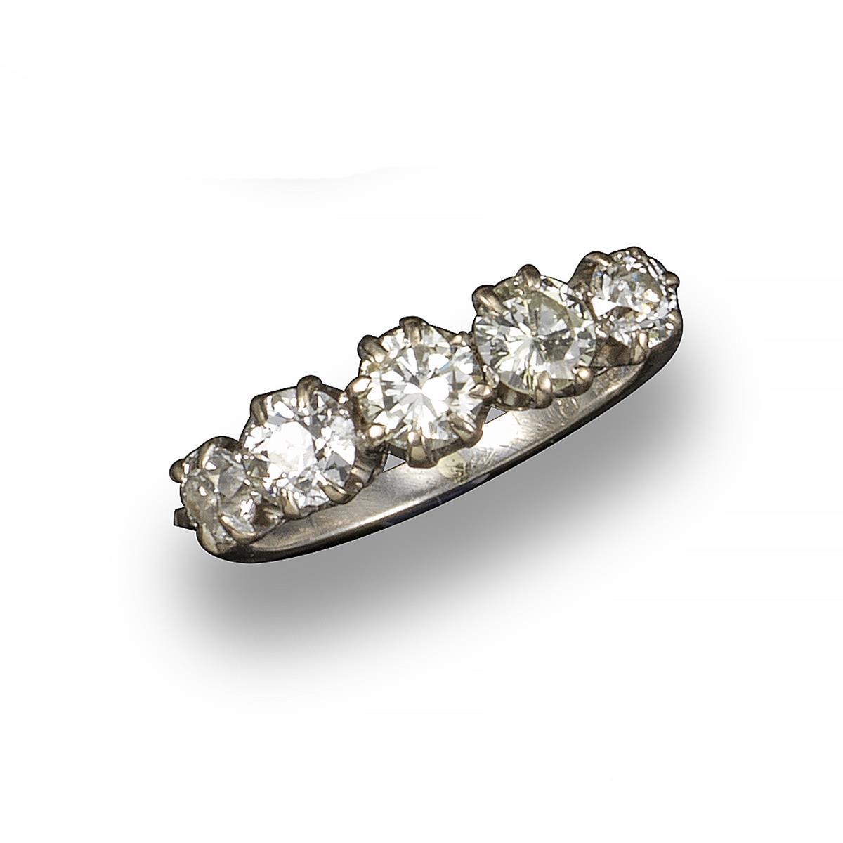 A diamond five-stone ring, the graduated circular-cut diamonds are set in platinum, size K ½