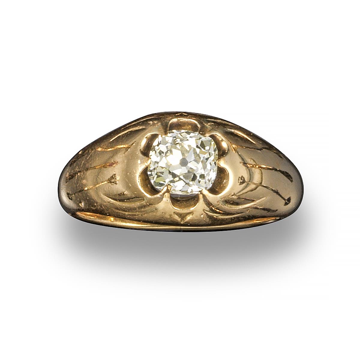 A diamond gypsy ring, the cushion-shaped diamond is claw-set in plain polished yellow gold shank, size K