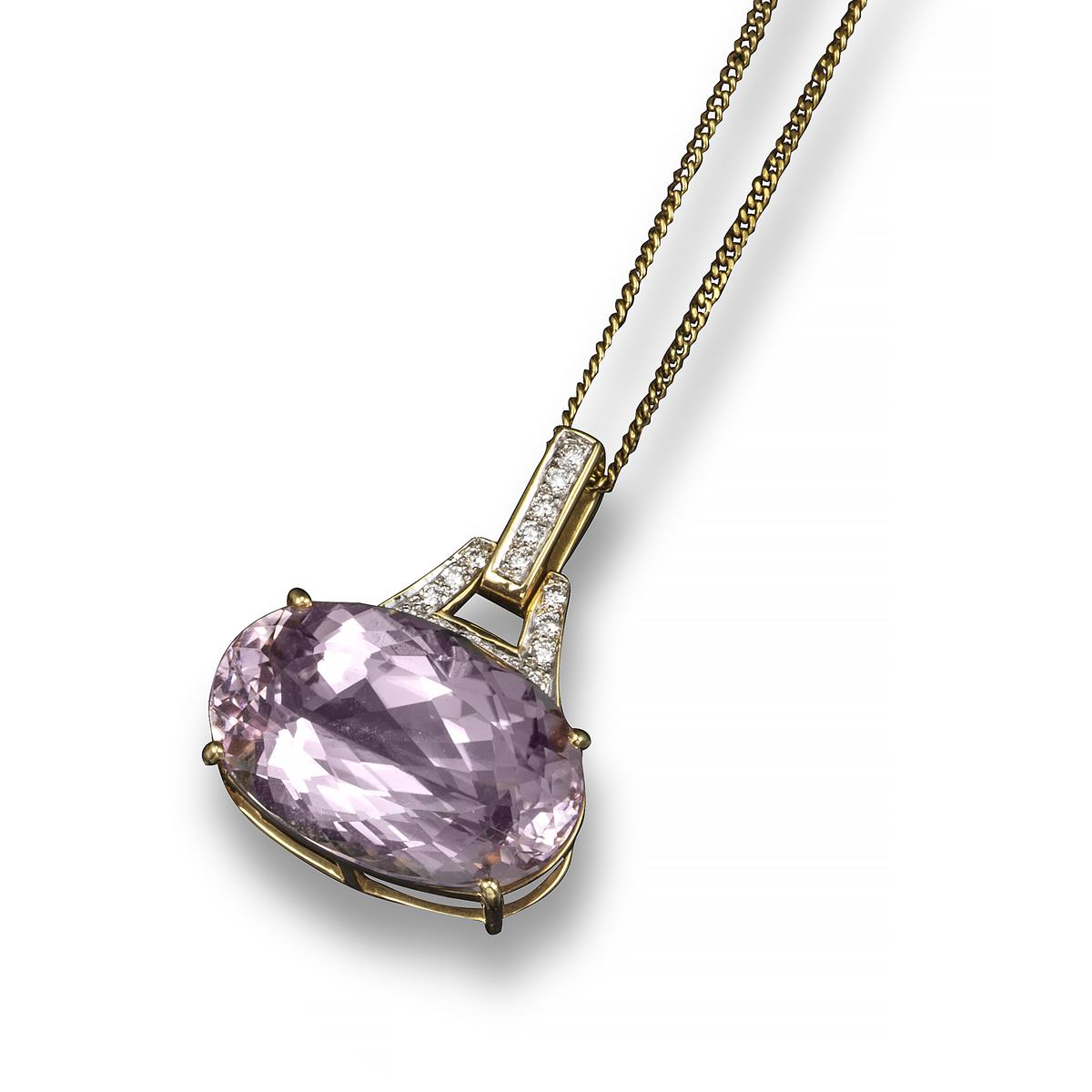 A kunzite and diamond-set gold pendant, the oval shaped kunzite set in yellow gold and with circular-cut diamonds set to the pendant mount, fine-link yellow gold chain