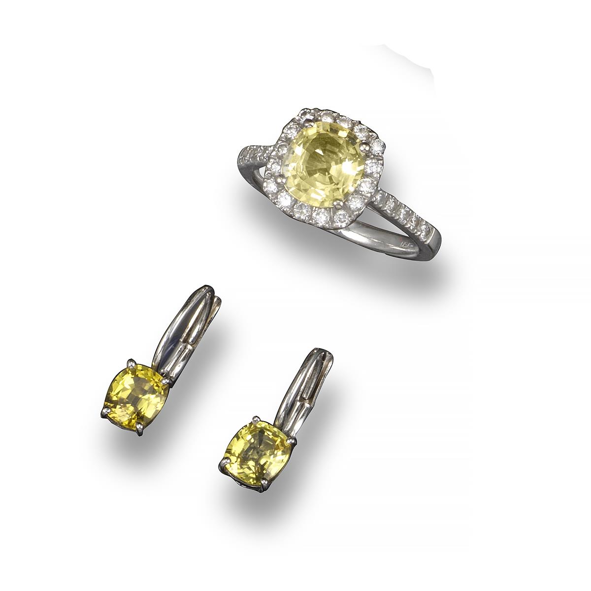 A sapphire and diamond cluster ring, the slightly oval-shaped sapphire set within a surround of round brilliant-cut diamonds and set in white gold with further round brilliant-cut diamonds to the shoulders, size L ½, with a pair of yellow sapphire-set white gold earrings
