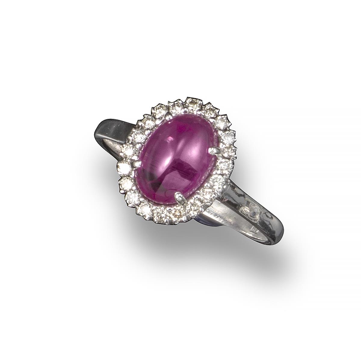 A cabochon ruby and diamond cluster ring, the oval-shaped ruby set within a surround of small round brilliant-cut diamonds in white gold, size N