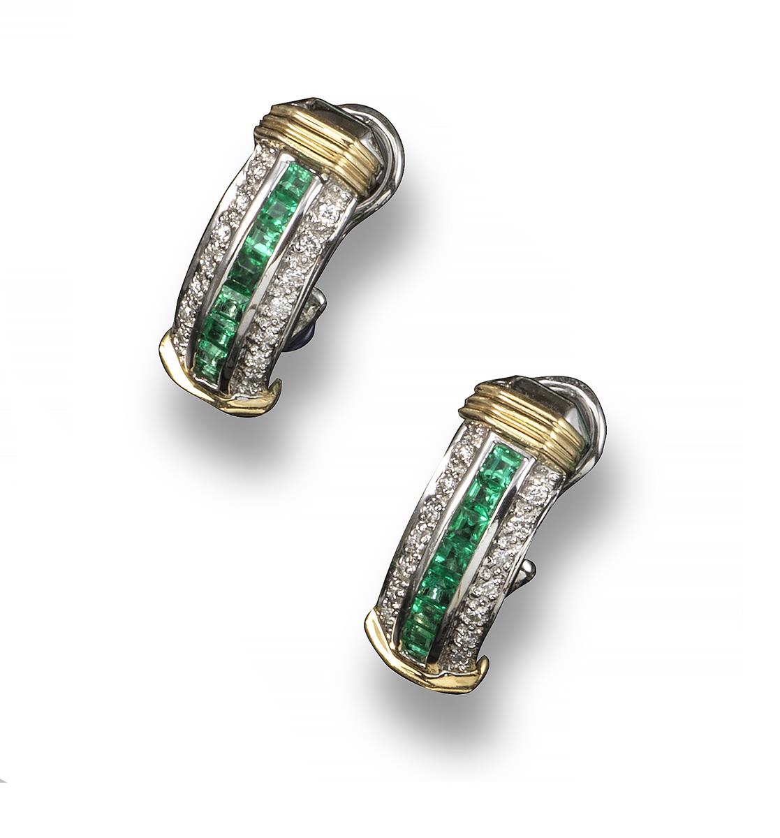 A pair of emerald and diamond half-hoop earrings, each set with a central line of calibré-cut emeralds within round brilliant-cut diamond borders in white and yellow gold, stamped 14kt and marker's mark C.E.I., post and clip fittings, 2cm long