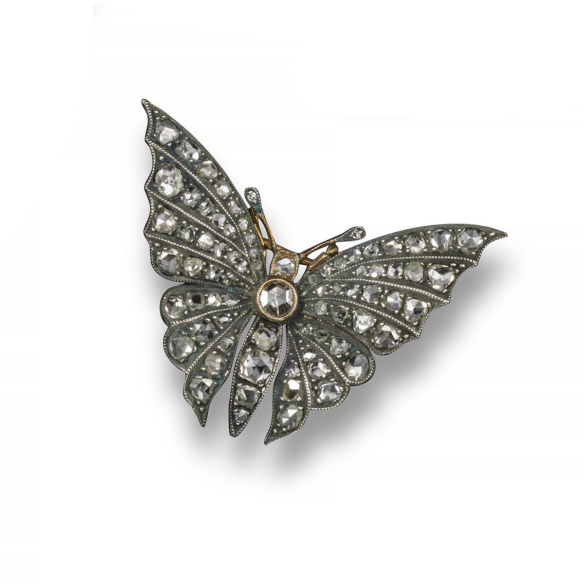A diamond-set butterfly brooch, the rose-cut diamonds are millegrain-set in silver and gold, 4cm wide