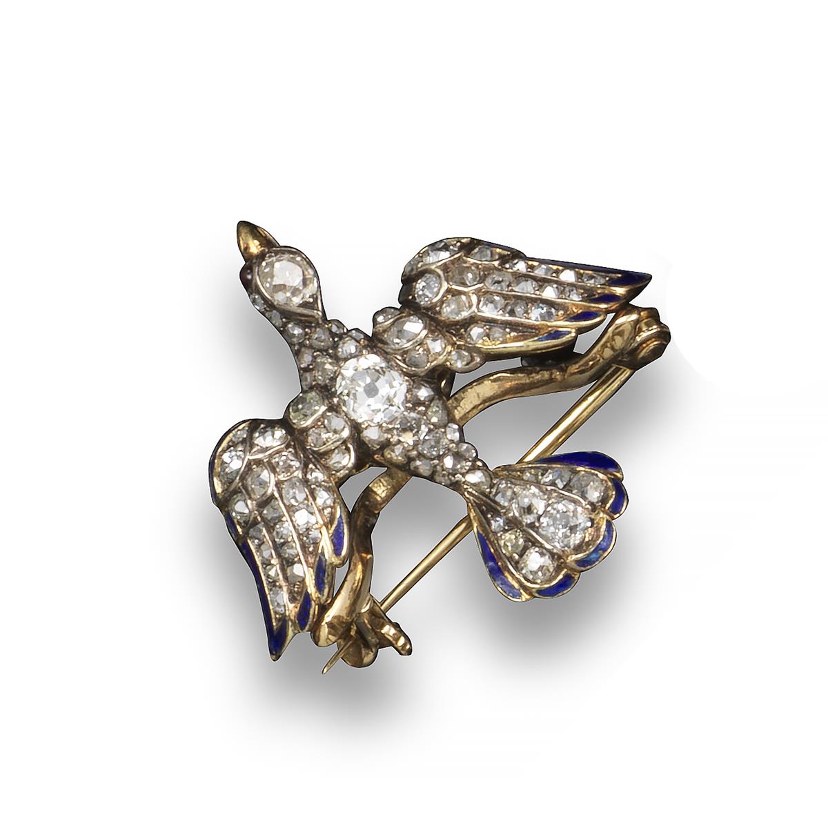 A 19th century diamond-set dove brooch, set with graduated old cushion-shaped diamonds, blue enamel to the wings and ruby eyes, set in silver and gold, 2.5cm wide