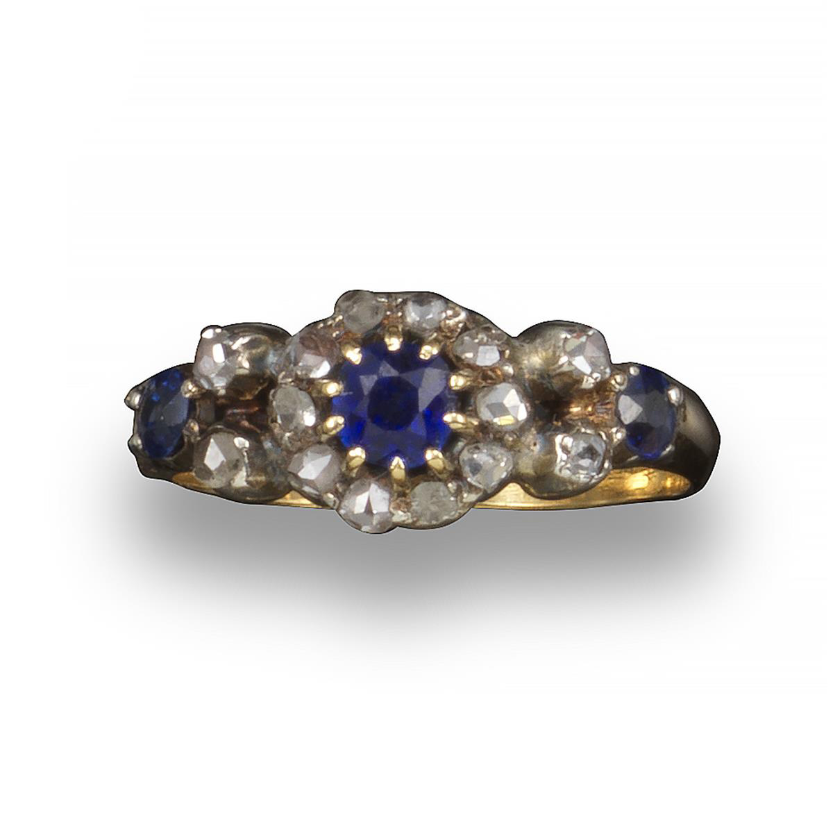 A Victorian sapphire and diamond cluster ring, the circular-cut sapphire is set within a surround of rose-cut diamonds within sapphire and diamond trefoil shoulders in silver and gold, size N 1/2