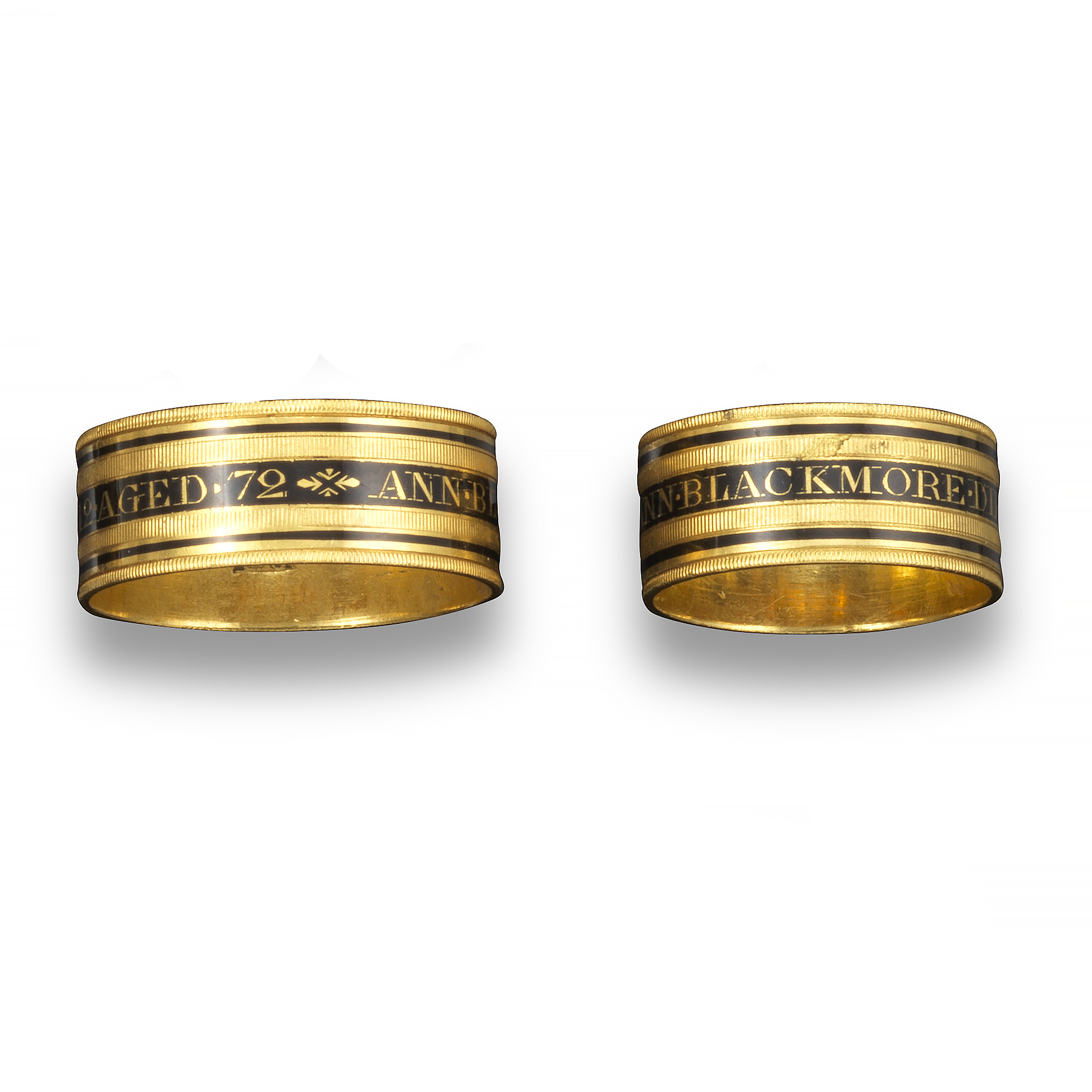 A pair of George gold mourning rings, with black enamel and inscription 'Ann Blackmore died 9 July 1812 aged 72' on both rings, fluted gold decoration and black enamel borders in yellow gold, London marks for 1812, maker's mark SG, sizes M 1/2 and U 1/2