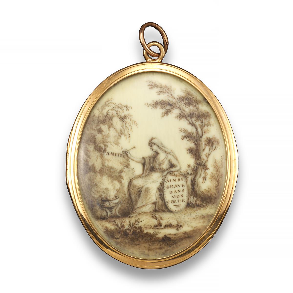 An early 19th century romantic pendant, one side painted in sepia on ivory depicting a seated woman with a French romantic message, the other with a locket compartment of curled hair tied with seed pearls, both sides with glass cover and in gold frame, 5cm high