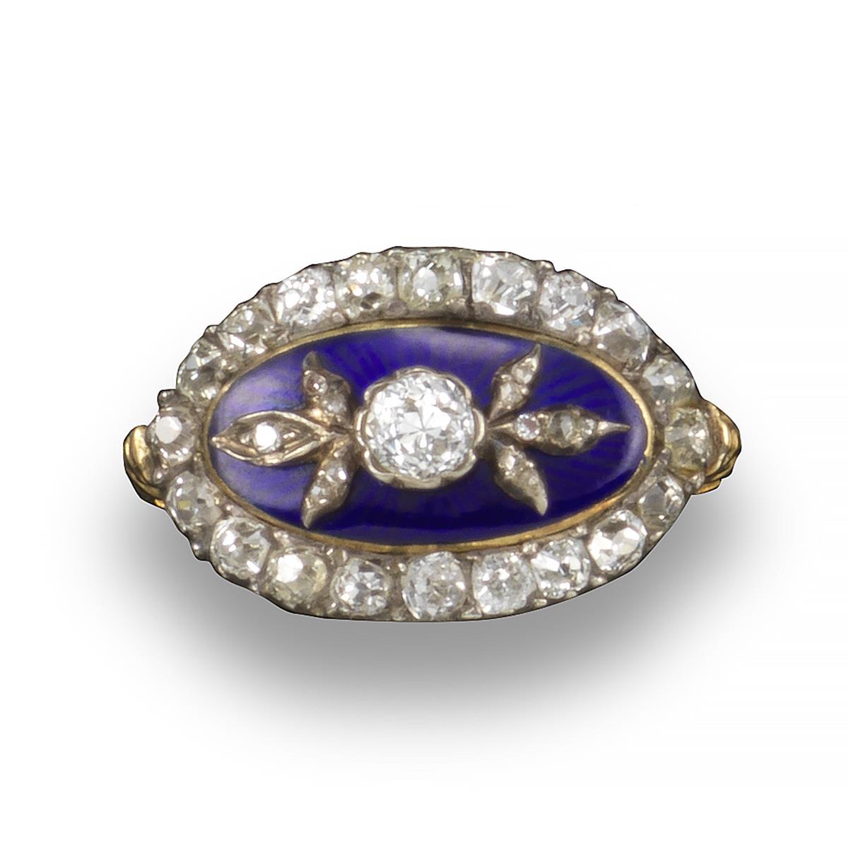 A late 18th century diamond and blue enamel ring, centred with a cushion-shaped diamond between diamond-set foliate sections, on blue guilloche enamel ground within a border of small cushion-shaped diamonds in silver and yellow gold, size Q
