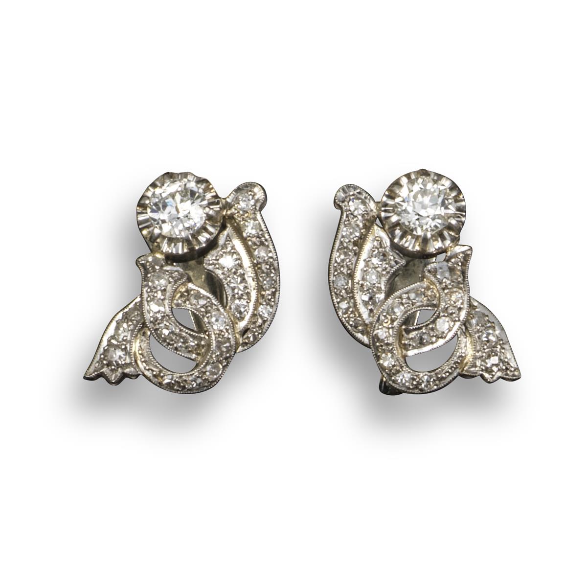 A pair of diamond-set scroll earrings, each earring set with an old circular-cut diamond and smaller diamonds to the inverted scrolls in white gold