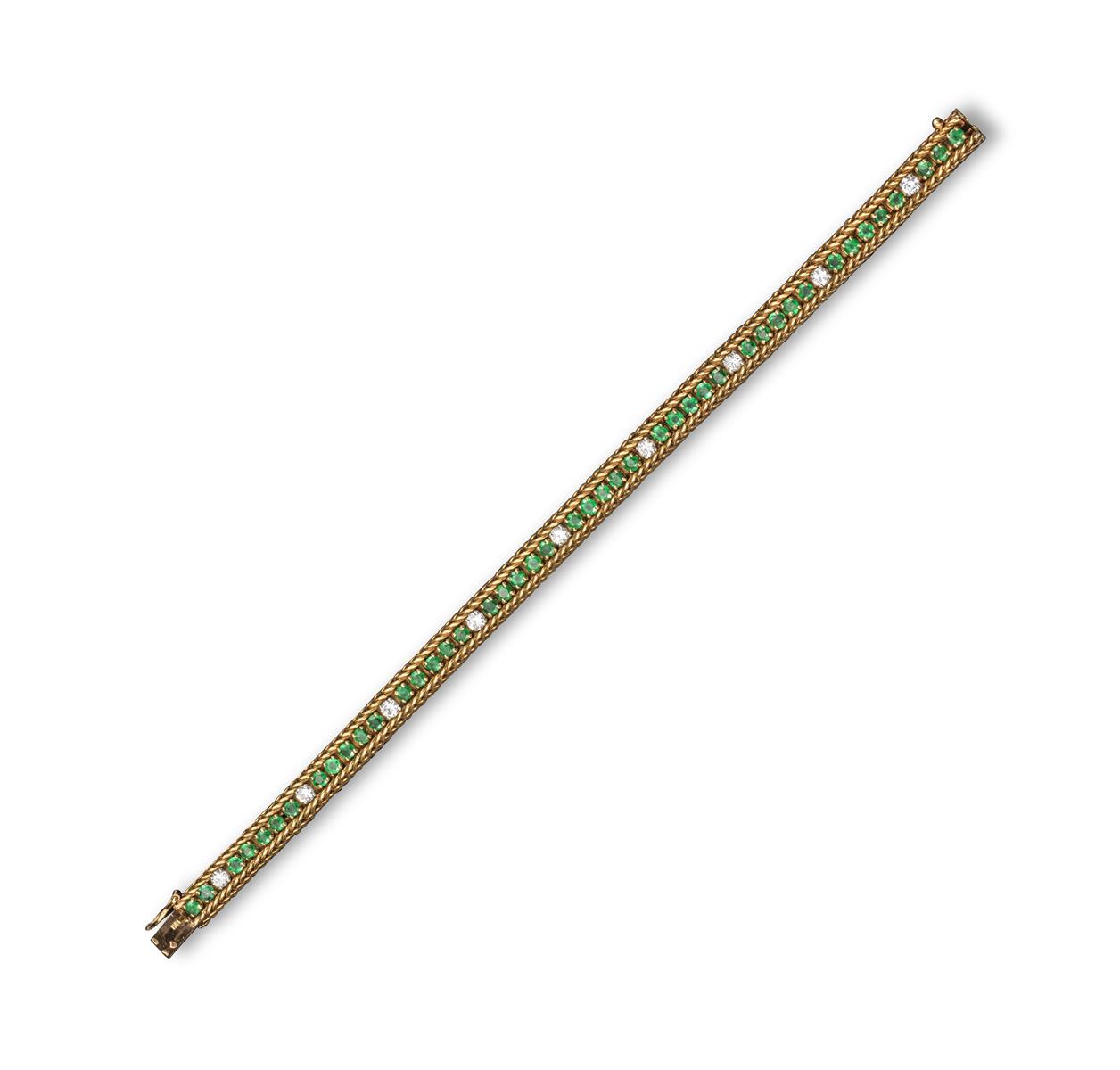 A French emerald and diamond bracelet, set with a central line of emeralds and diamonds within yellow gold ropetwist border, 17.5cm long, French control marks