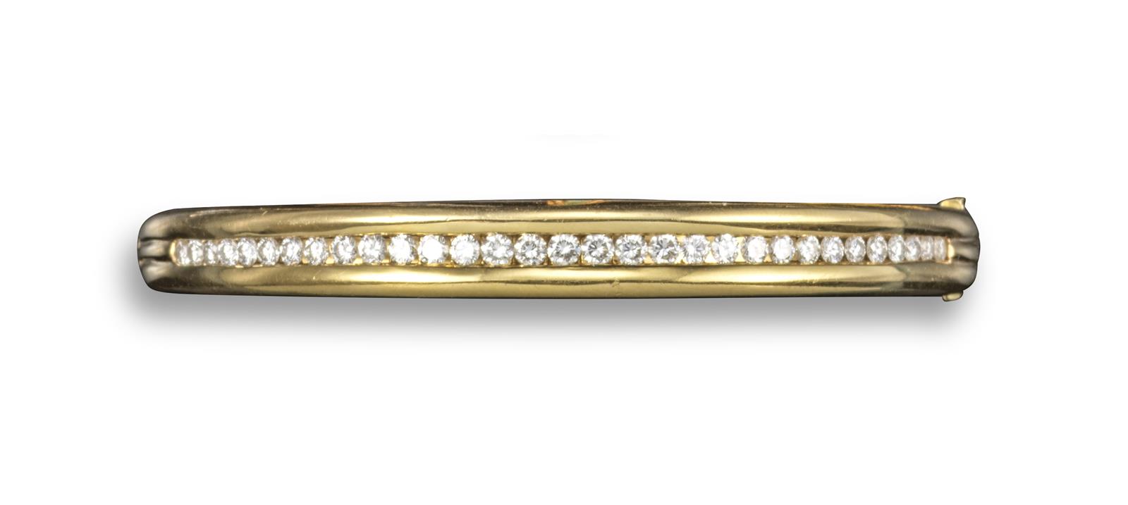 A diamond-set gold bangle, the plain polished yellow gold bangle is set with a line of graduated circular-cut diamonds, maker's mark TP and date marks for 1997, 6cm inner diameter, 31g