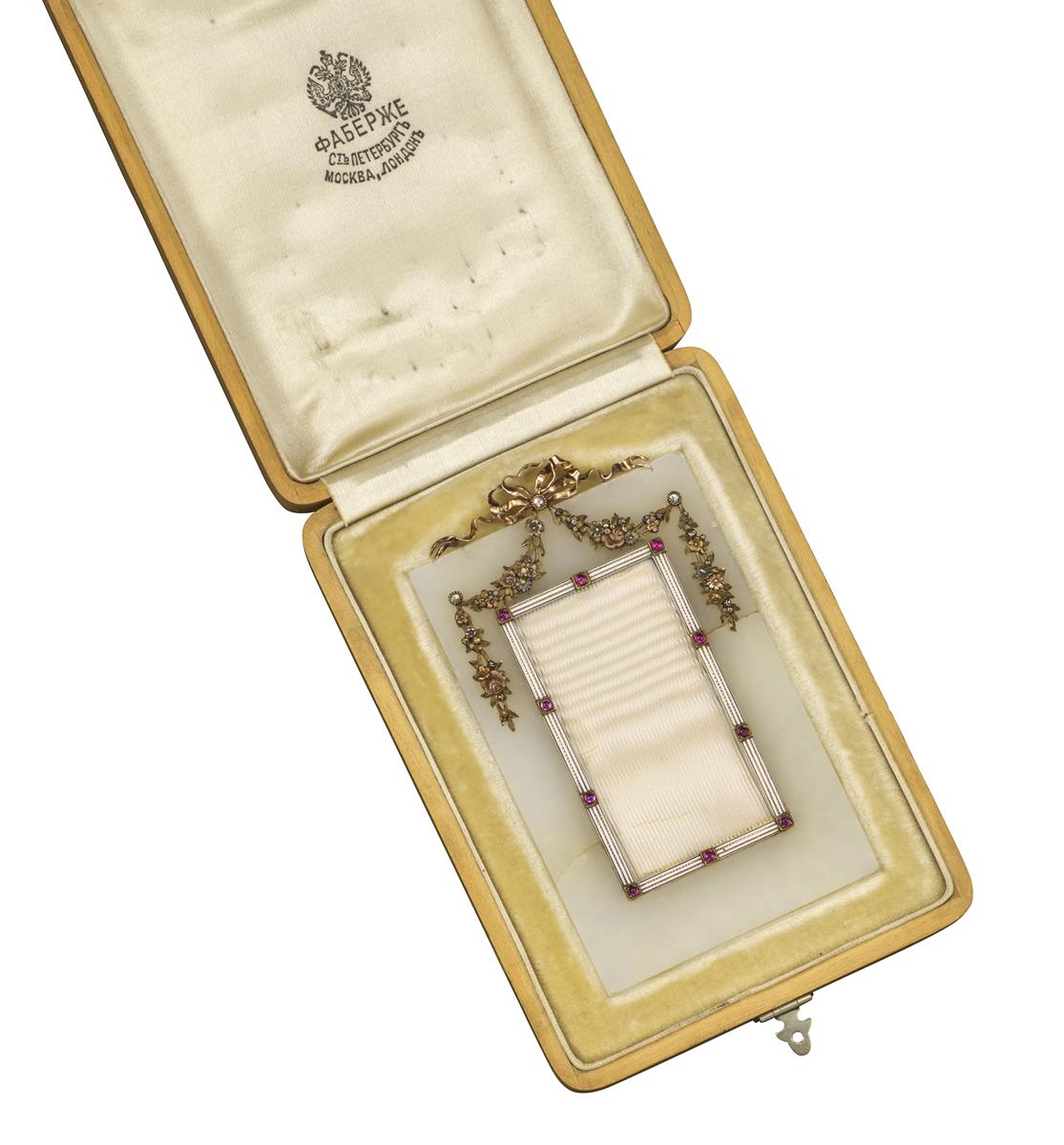 A hardstone frame by Fabergé, workmaster Karl Armfelt, the rectangular chalcedony frame (damaged) with ten cabochon rubies set to the internal white enamel striated border, three-colour gold swags suspended from a diamond-set gold bow, silver strut support on shell backing, with gold ring above the strut, unscrewing to release the shell back-section, signed to gold strut with workmaster's initials ЯA and 88 zolotnik, inventory number 14351, 8cm high, fitted hollywood box, the silk with imperial eagle over the Fabergé mark