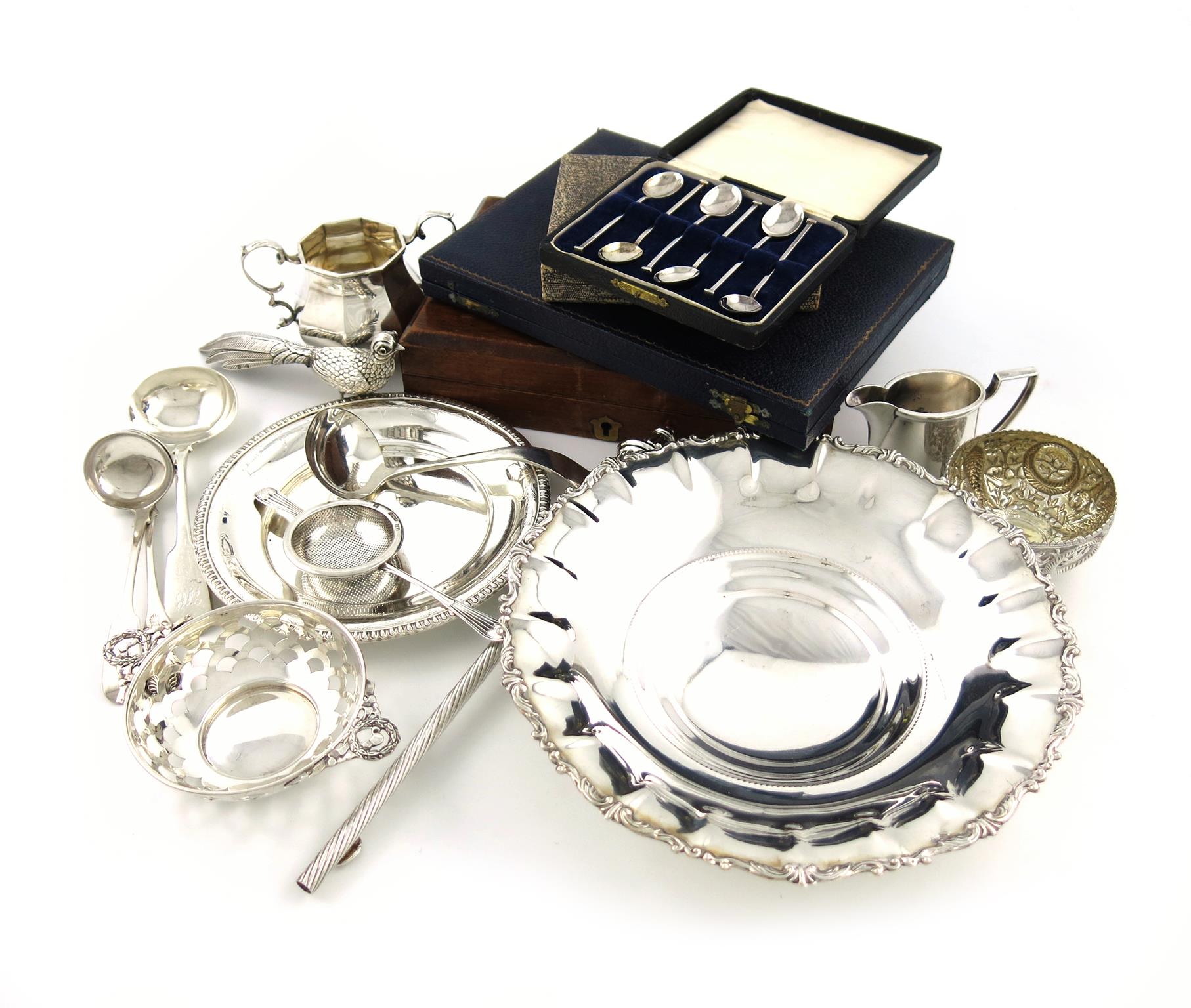 A mixed lot, comprising silver items: a Victorian dish, by Martin, Hall and Co, Sheffield 1867, circular form, stylised border, a pierced bonbon dish, a Scottish provincial toddy ladle by Cameron of Dundee, another Scottish toddy ladle by Philip Grierson of Glasgow, a sugar bowl, London 1899, a sauce ladle, a cased set of six tea spoons, and six cased coffee spoons, a tea strainer, a cased set of four ashtrays and matchbox covers, plus metalware items: a taper holder, a circular bowl, a bird, and a small bowl, plus electroplated items: a set of cased fruit eaters, a cream jug and a ladle, approx. weighable 30oz. (qty).