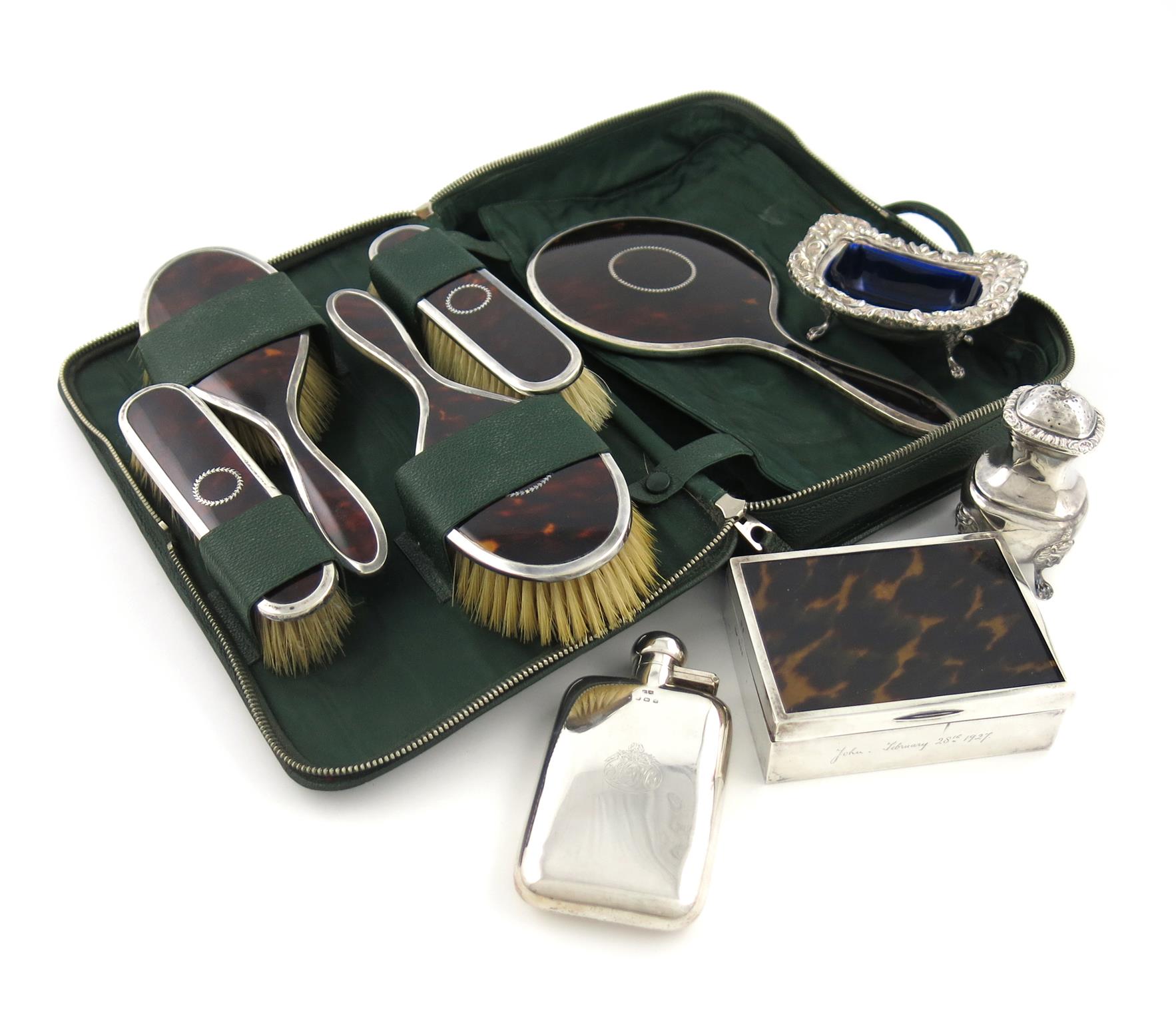 comprising: a hip flask, by H. Matthews, Birmingham 1926, rounded rectangular form, bayonet fitting cover, plus a five-piece silver and tortoiseshell dressing table set, by The Adie Brothers, Birmingham 1933, with inlaid decoration, cased, a silver and tortoiseshell cigarette box, with a plain tortoiseshell panel, a.f, and a Chinese metal ware salt cellar and pepper pot, approx. weighable 3.8oz. (5)