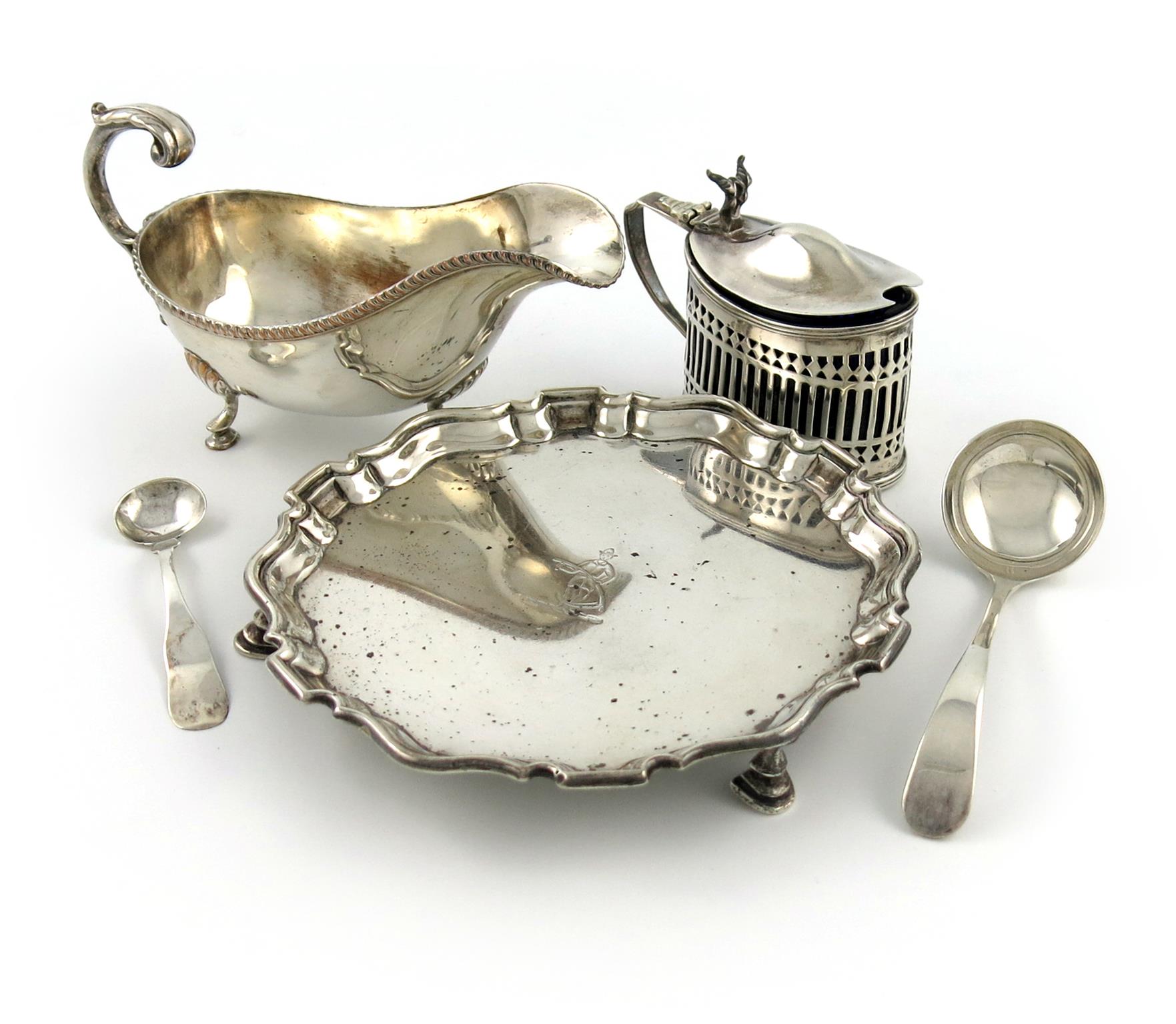 A mixed lot of silver items, comprising: an Edwardian waiter, London 1903, moulded border, the centre with a crest, plus a mustard pot, a sauce ladle, a mustard spoon and an electroplated sauce boat, approx. weighable 9.5oz. (5)