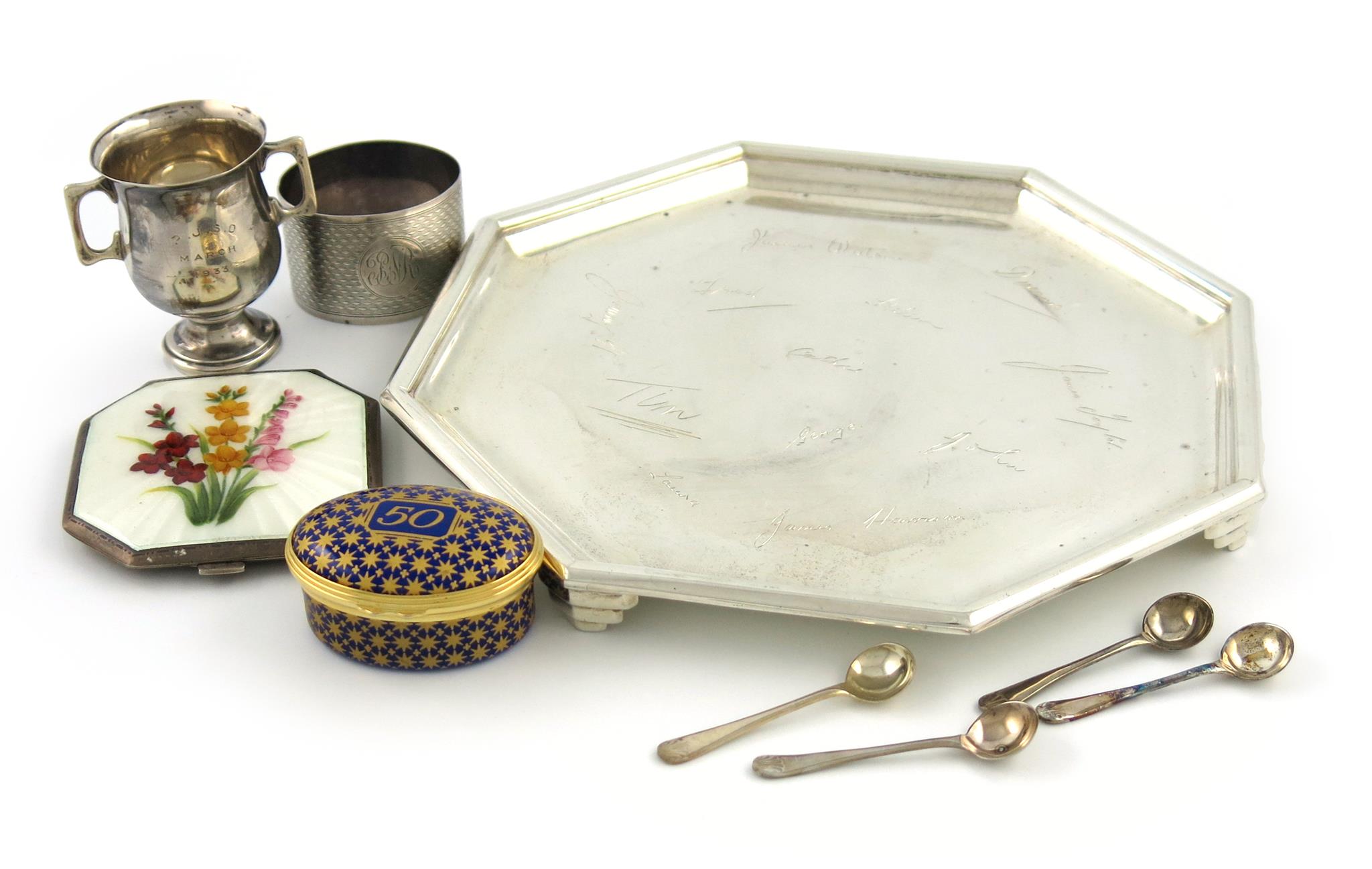 comprising silver items: a presentation waiter of octagonal form, inscribed, Birmingham 1939, plus a silver and enamel compact, four salt spoons, a napkin ring and a miniature trophy cup, plus a modern Halcyon Days box, approx. weighable 17oz. (7)