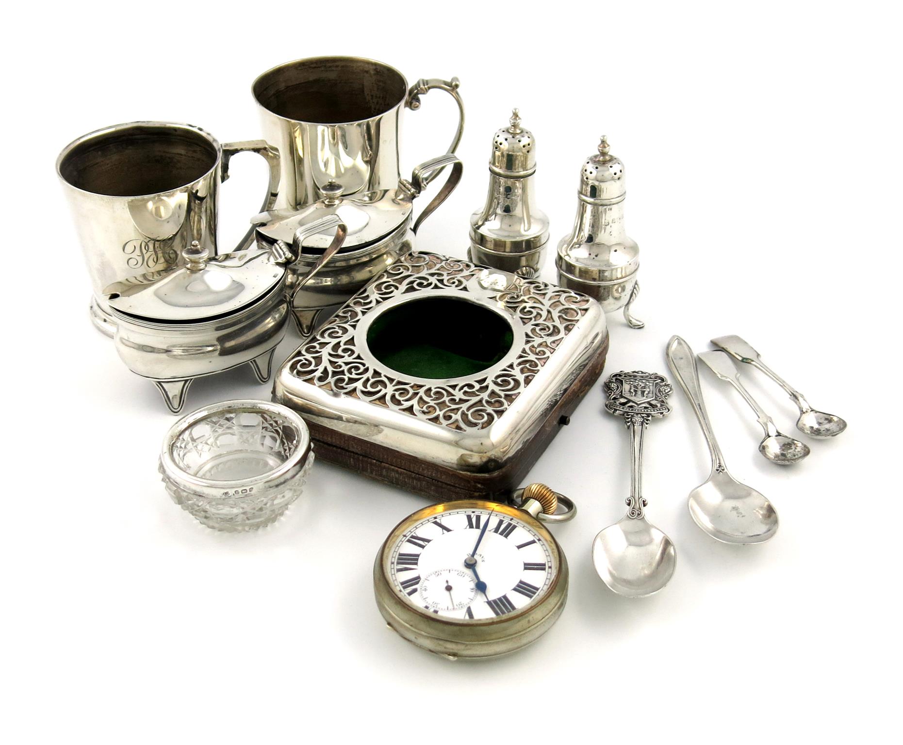 comprising: two christening mugs, a pair of mustard pots, London 1913, a pair of pepper pots, a salt cellar, two spoons, and a silver-mounted clock, London 1914, with pierced decoration, approx. weighable 17oz. (qty)