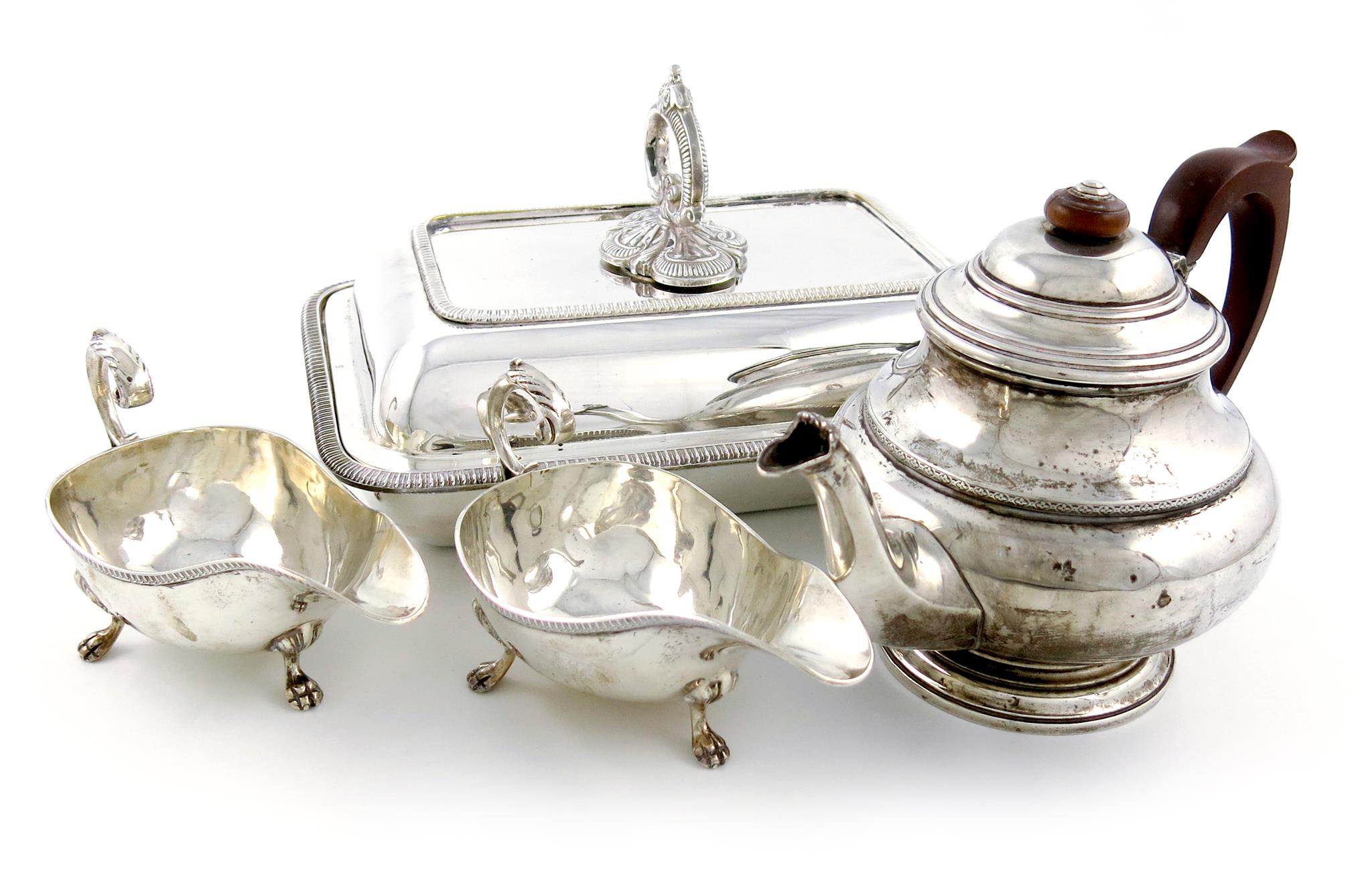 A mixed lot, comprising silver items: a tea pot, of circular form, by the Adie Brothers, Birmingham 1932, plus a pair of oval sauce boats, Birmingham 1899, and an electroplated entrée dish and cover, approx. weighable 23.5oz. (4)