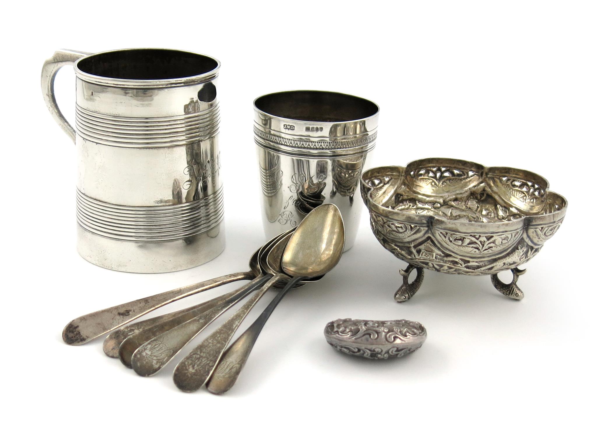 comprising: a Victorian mug, London 1877, tapering circular form, a beaker with London import marks for 1899, an Indian bowl, a Chinese kidney shaped ornament, plus five Peter and William Bateman teaspoons and one other, approx. weight 14oz. (10)