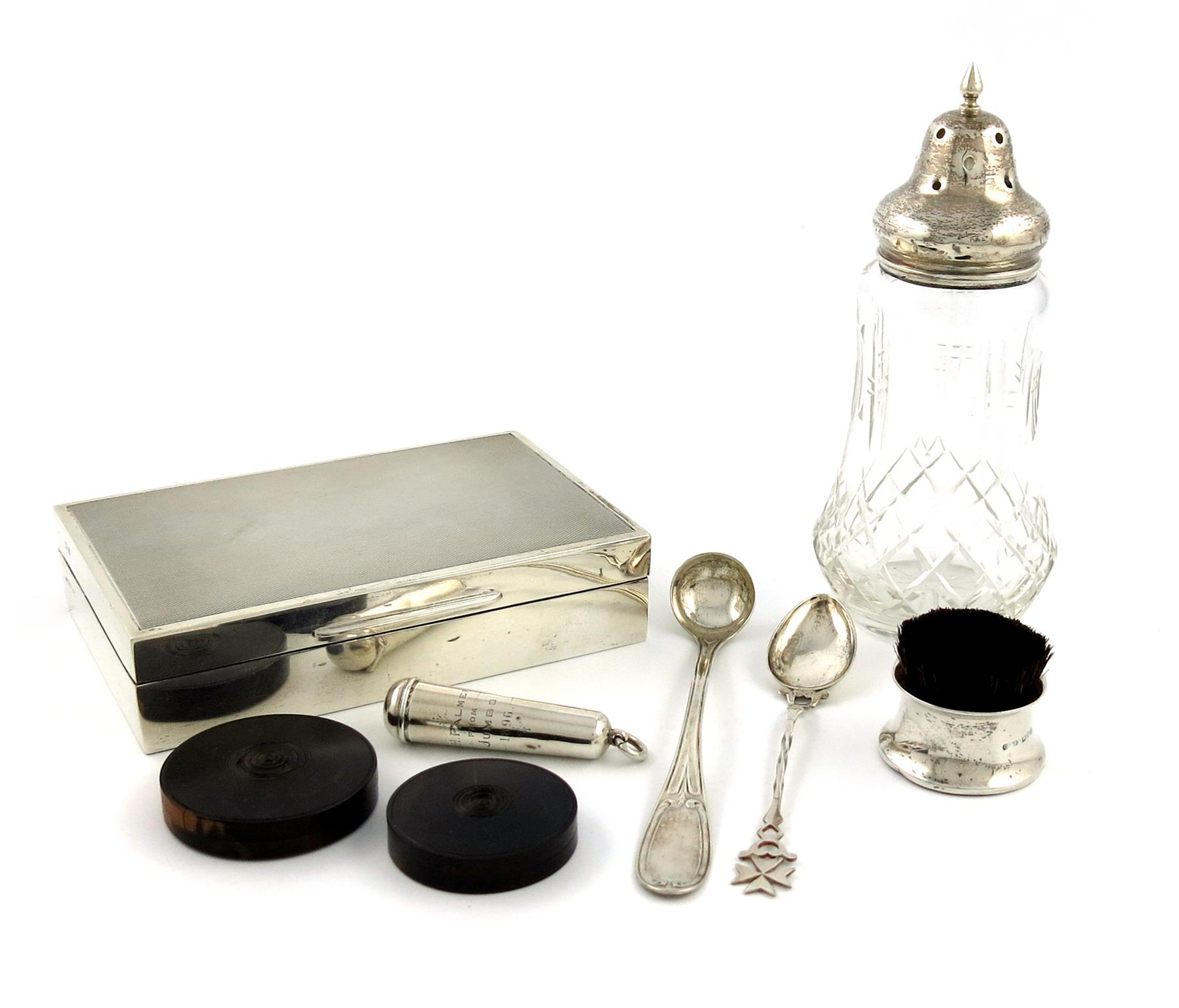 comprising: a pen wipe, by Saunders and Shepherd, Chester 1904, a cigarette box, a silver-mounted glass sugar caster, a cigarette holder, a spoon, an American ladle and two wooden boxes, approx. weighable 1.6oz. (8)