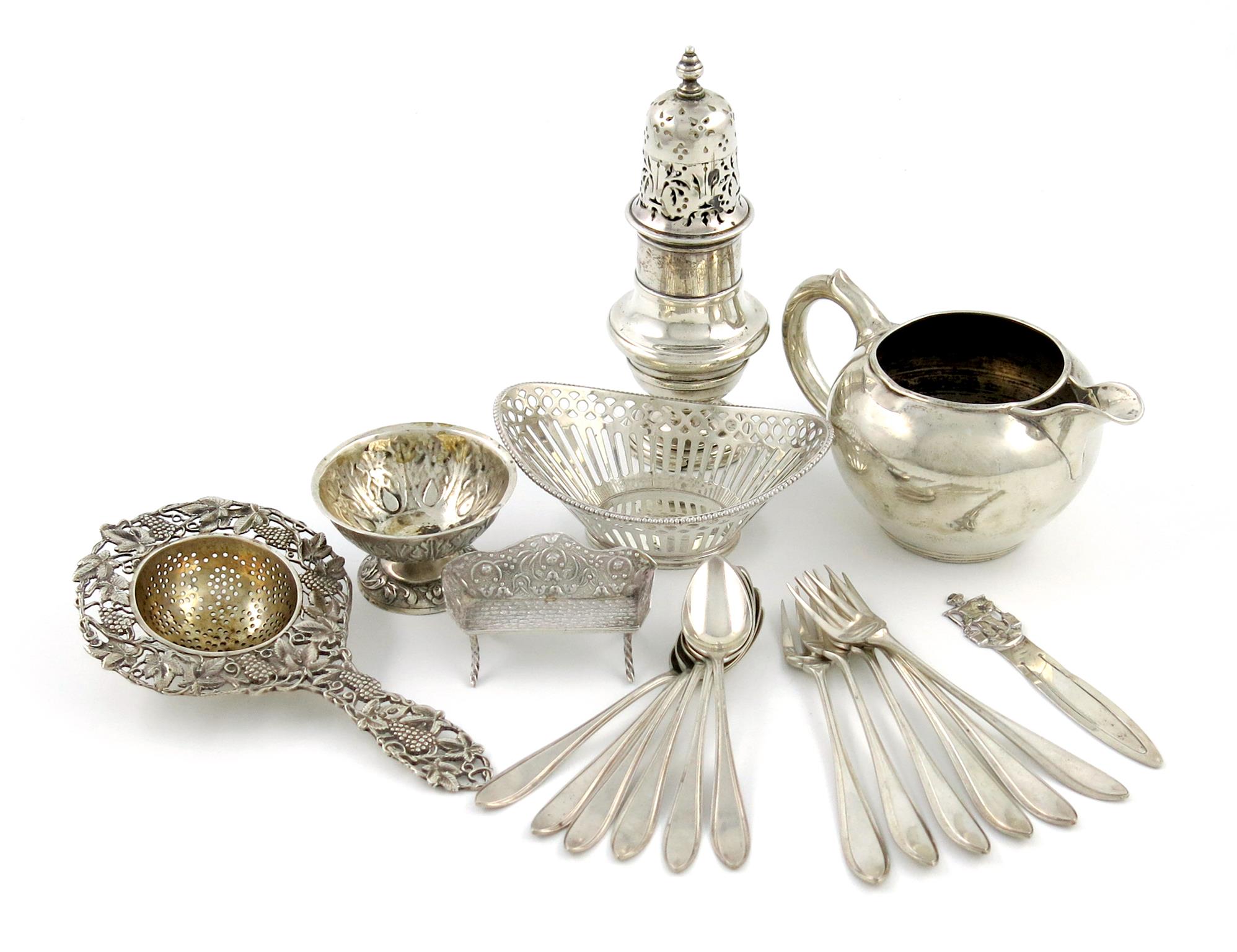 A mixed lot of Dutch silver items, comprising: a sugar caster, a cream jug, a pierced basket, a tea strainer, a salt cellar, a miniature sofa, six small forks and spoons, and a book mark, approx. weight 15oz. (qty)