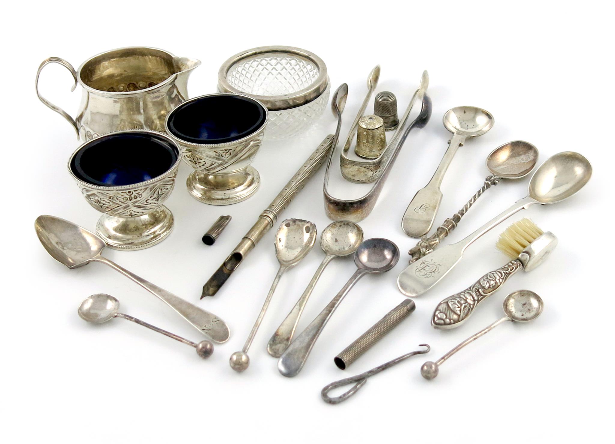 comprising: a pair of Victorian salt cellars, by Thomas Smily, London 1864, circular form, a small cream jug, by Charles Stuart Harris, London 1883, a silver-mounted glass salt cellar, a dip pen, a moustache brush, a pair of sugar tongs, five silver spoons, two thimbles, five electroplated items and two other items, approx. weighable 5.5oz. (qty)