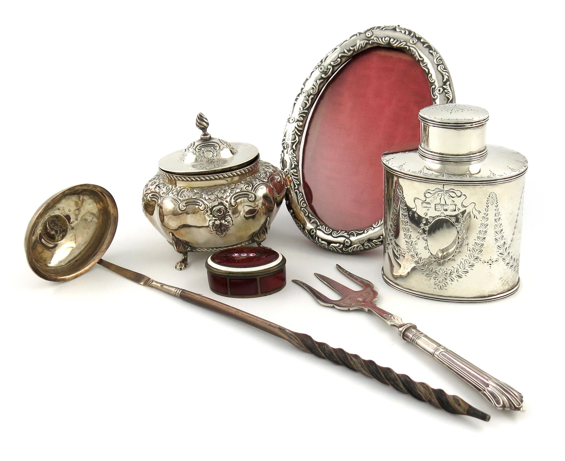 comprising: a late-Victorian tea caddy, by Carrington and Co, London 1897, of oval form, pull-off cover, engraved decoration, a late-Victorian tea caddy of bombé form, embossed decoration, Birmingham 1897, plus an oval photograph frame, a punch ladle, the bowl set with a coin, twisted whale-bone handle, plus a base metal and enamel box and an electroplated bread fork, approx. weighable 10oz. (6)