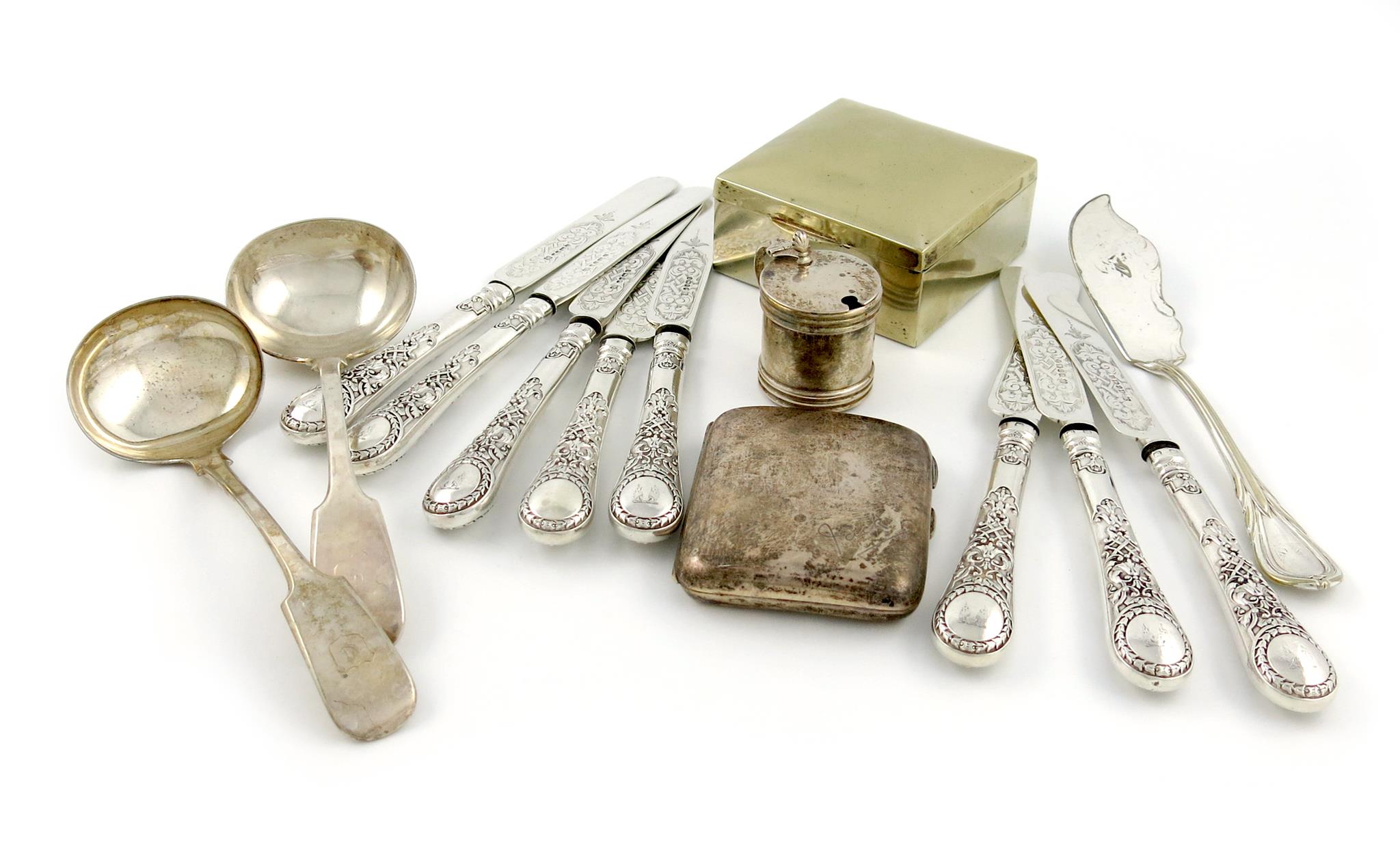 A mixed lot, comprising silver items: a set of eight Victorian Venetian pattern fruit knives, Sheffield 1875, plus a cigarette case, and a mustard pot, plus an electroplated cigarette box and three items of flatware, approx. weighable 4oz. (qty)