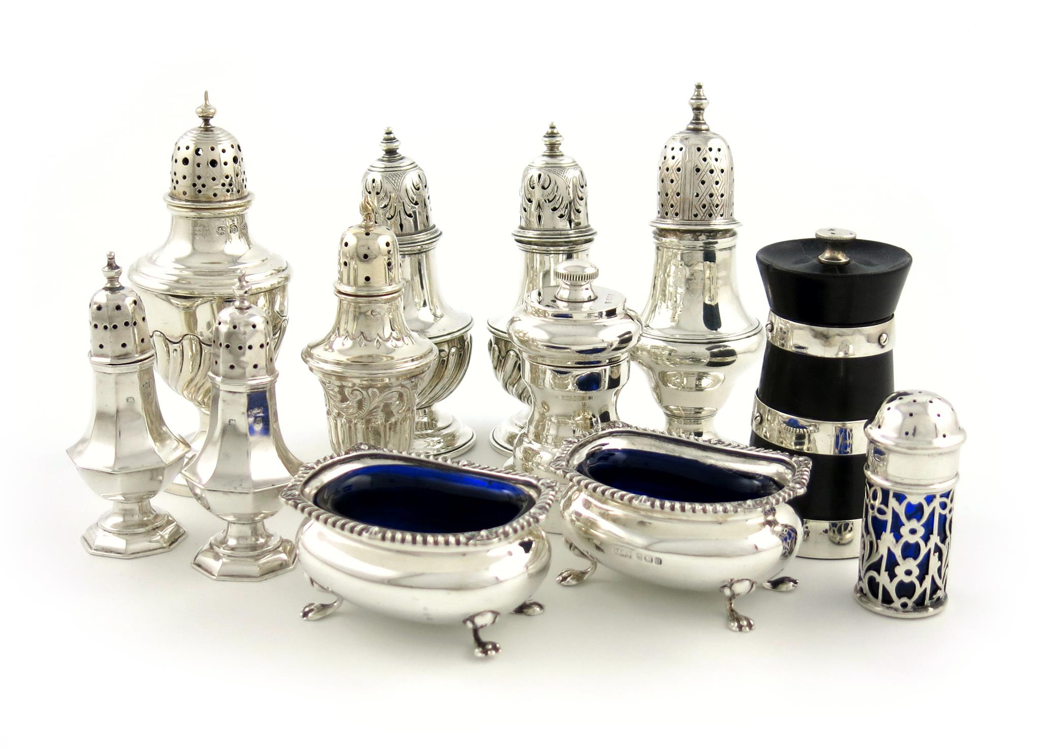 comprising: a George III pepper pot, London 1777, an Edwardian silver-mounted churn pepper mill, by Heath and Middleton, London 1906, a modern pepper mill, a pair of salt cellars, two pairs of pepper pots and three single pepper pots, approx. weighable 16oz. (12)