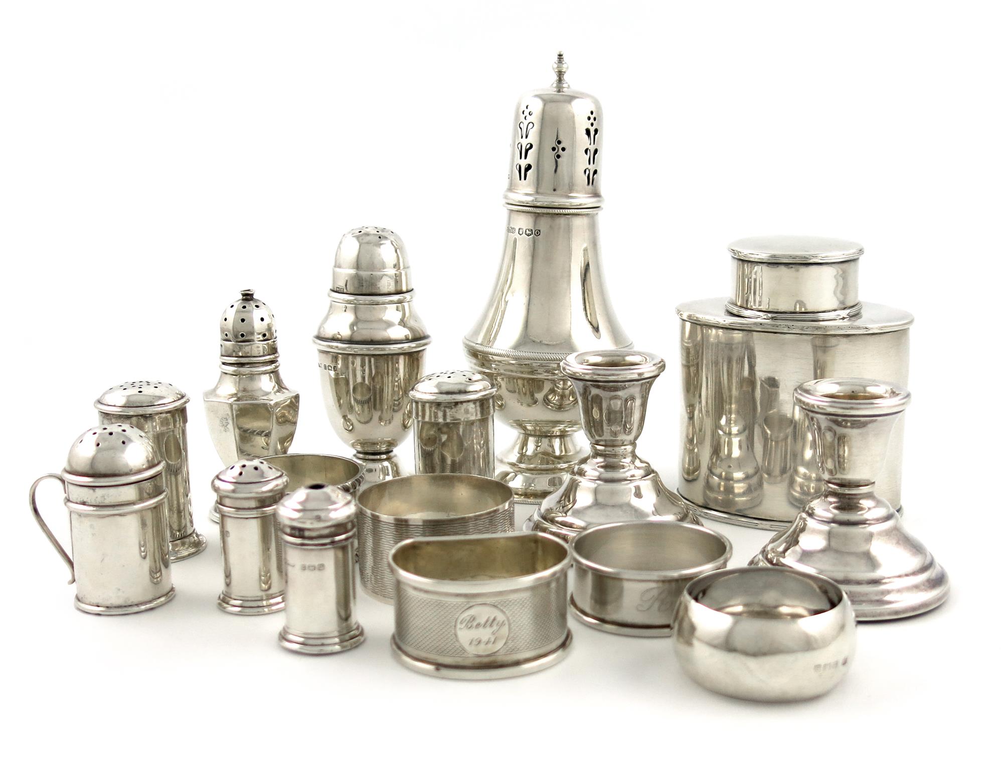 comprising: an Edwardian tea caddy, Birmingham 1905, oval form, pull-off cover, plus a sugar caster, a pair of dwarf candlesticks, a kitchen pepper pot, a pair of pepper pots, a salt and pepper pot, two further pepper pots and five napkin rings, approx. weighable 14.8oz. (qty)