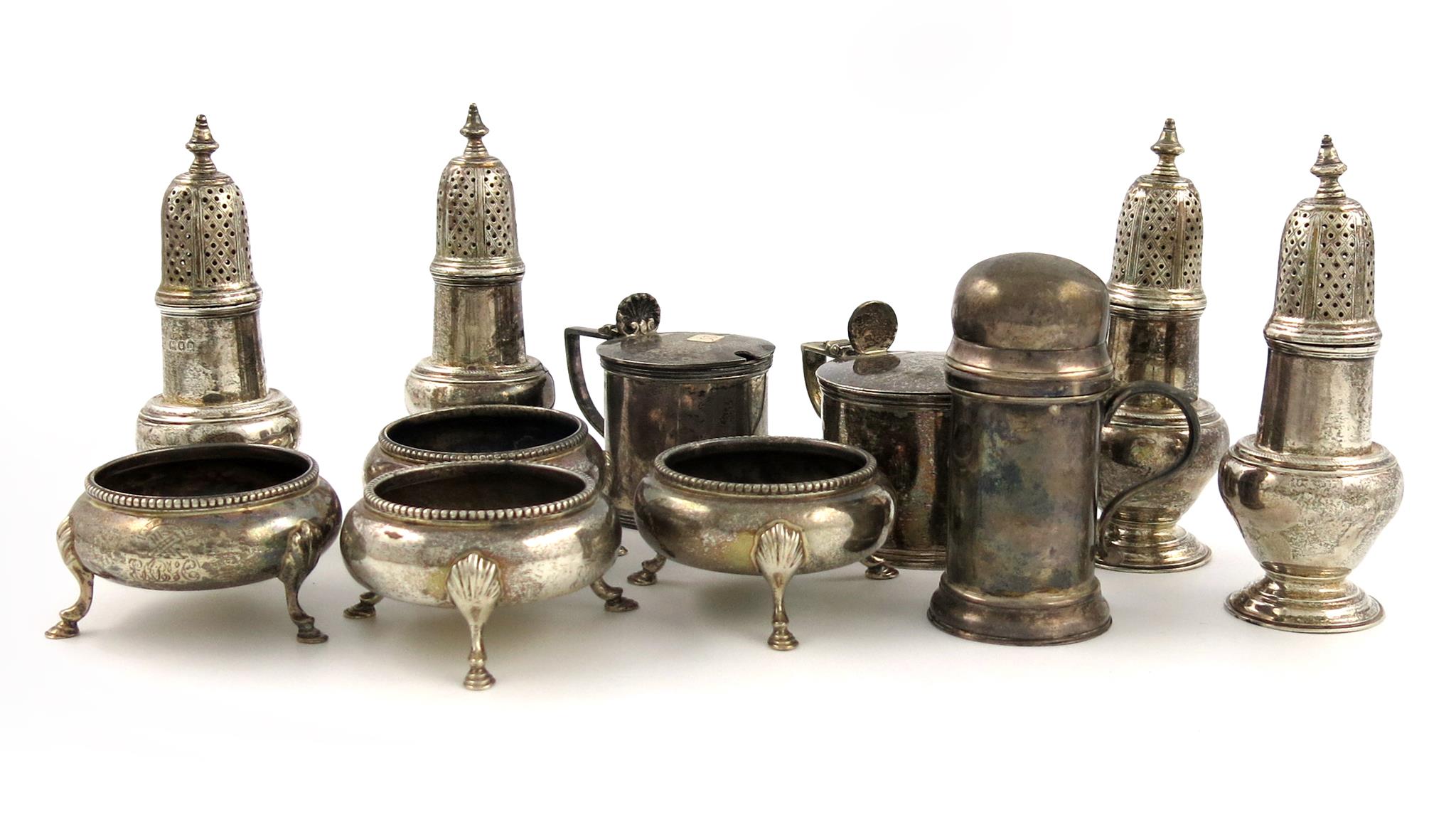 comprising: a set of four pepper pots, by A and F Parsons, London 1917, a mustard pot, London 1832, another mustard pot, four Victorian salt cellars, and a mustard pot, London 1903, approx. weight 31oz. (11)
