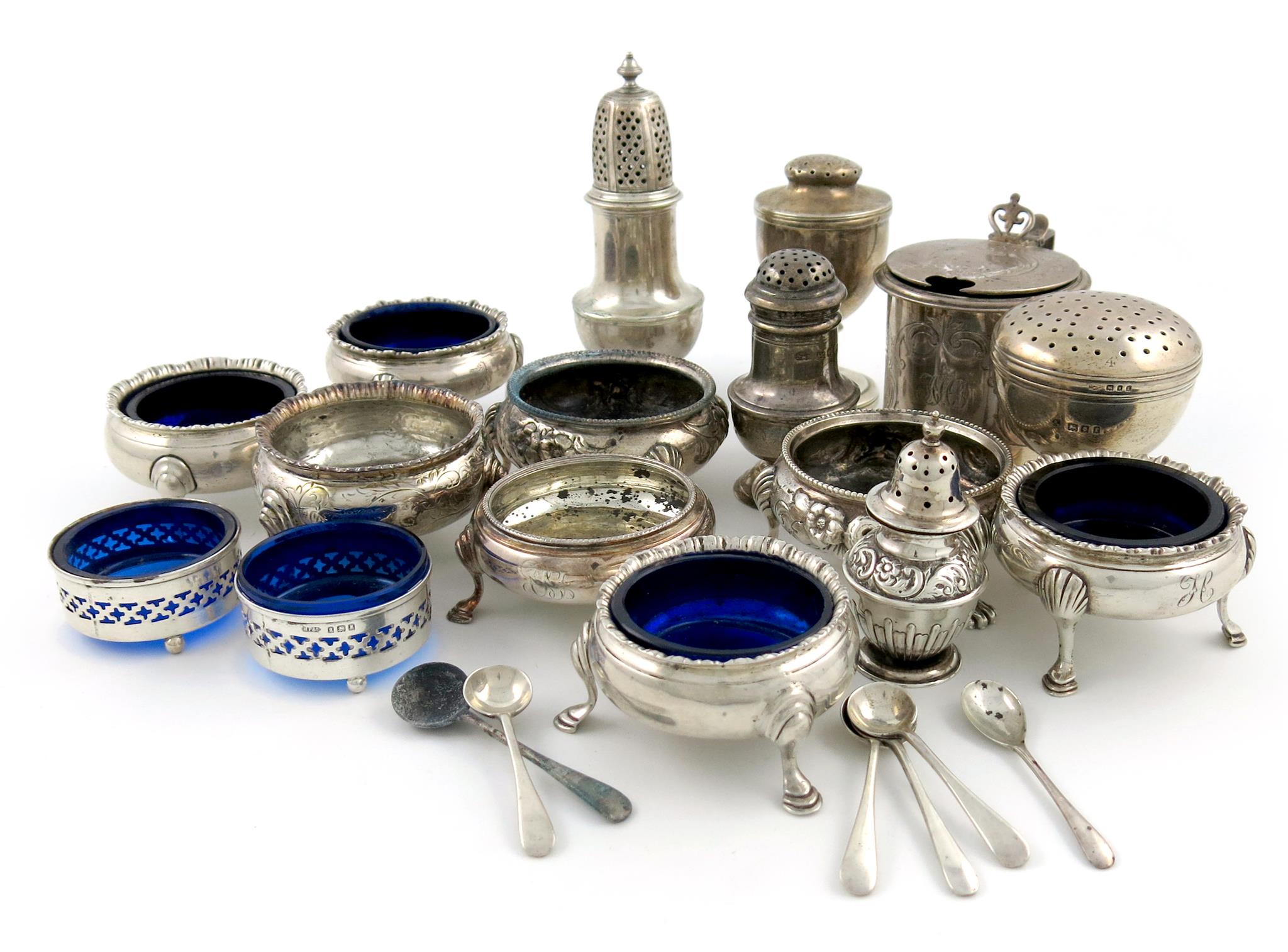 comprising: a Victorian mustard pot, by John Keith, London 1859, circular form, engraved decoration, plus two pairs of Georgian salt cellars of cauldron form, a Victorian pair, London 1863, two others, five casters, a pair of salt cellars and various spoons, approx. weight 30oz. (qty)