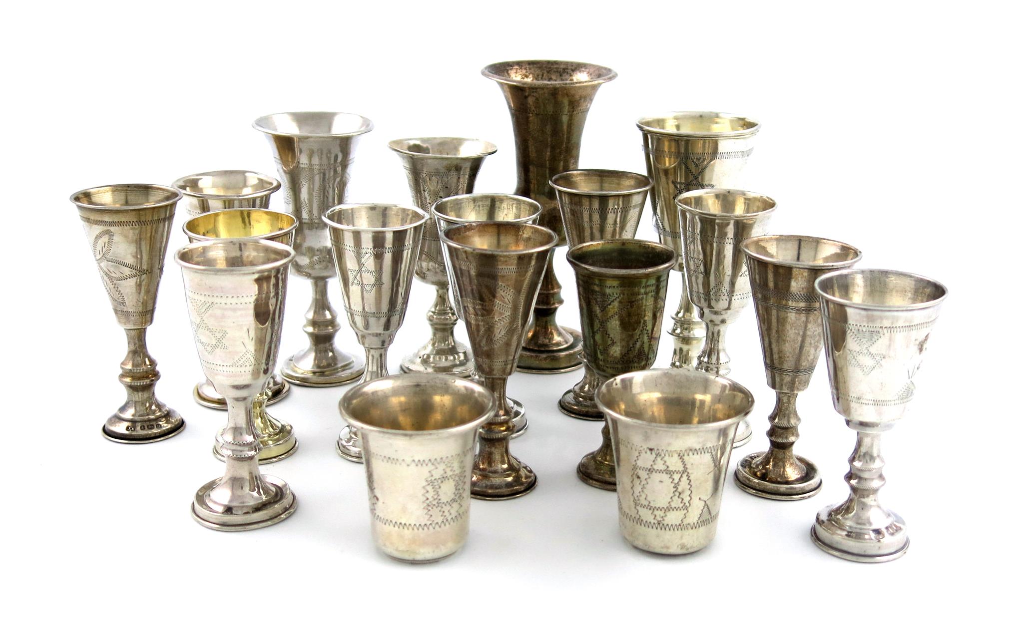 A collection of sixteen silver kiddish cups, various dates and makers, baluster and tapering circular bowls, on raised circular bases, plus two continental metalware Kiddish cups of tapering beaker form, approx. weight 13oz. (18)
