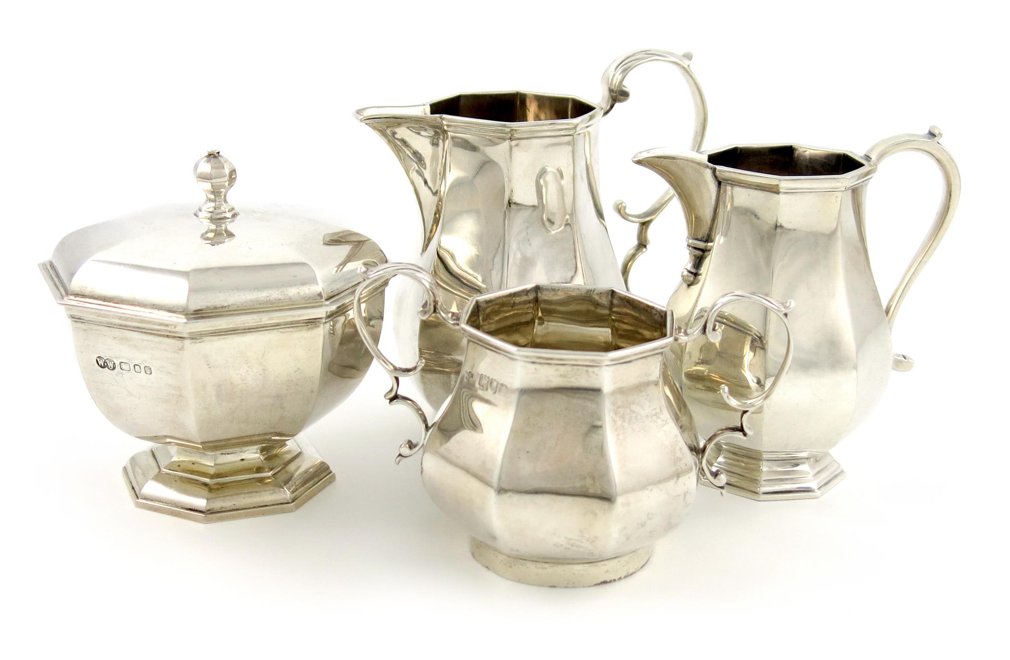 A modern silver sugar bowl and cover, by William Walter Antiques Ltd, London 1968, tapering octagonal form, plus a similar cream jug by the same maker, London 1979, and another cream jug, London 1923 and a sugar bowl 1899, approx. weight 32oz. (4)