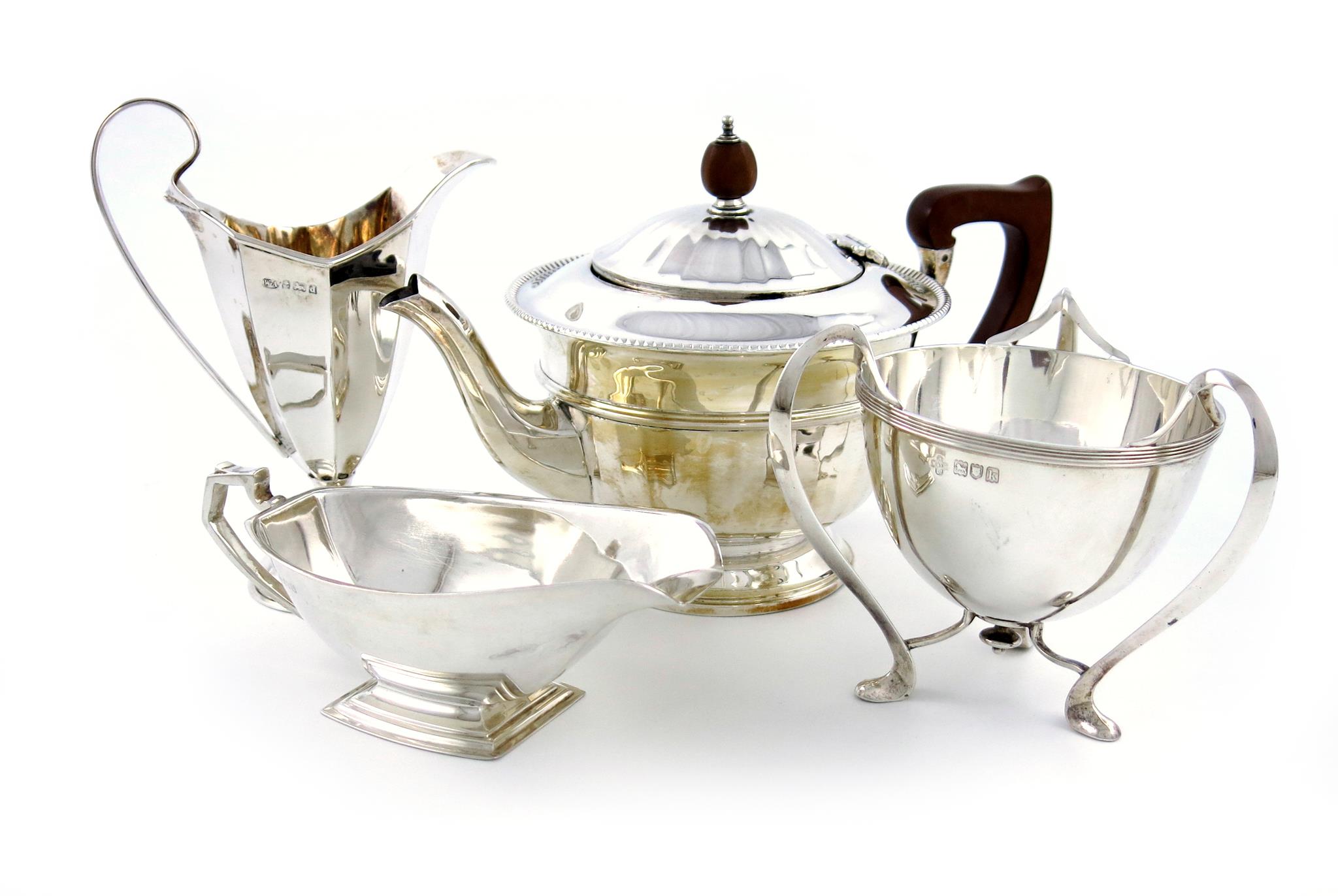 A mixed lot of silver items, comprising: an Edwardian three-handled tyg, London 1905, reeded border, a teapot of circular form, by The Adie Brothers, Birmingham 1933, a sauce boat and a cream jug, approx. weight 28.5oz. (4)