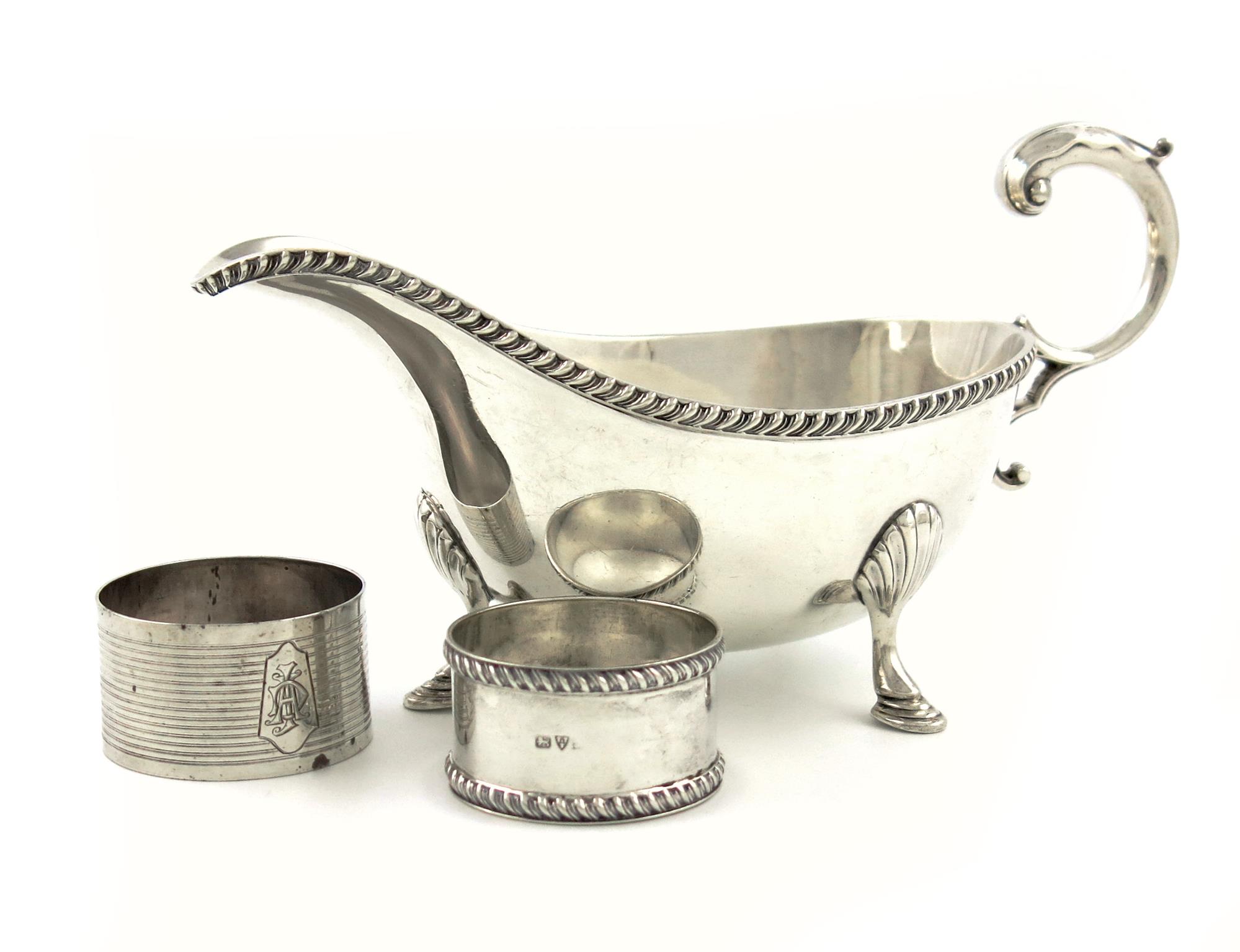 A silver sauce boat, by Mappin and Webb, Sheffield 1930, oval form, gadroon border, leaf capped scroll handle, on four hoof feet, plus two silver napkin rings, approx. weight 9.5oz. (3)