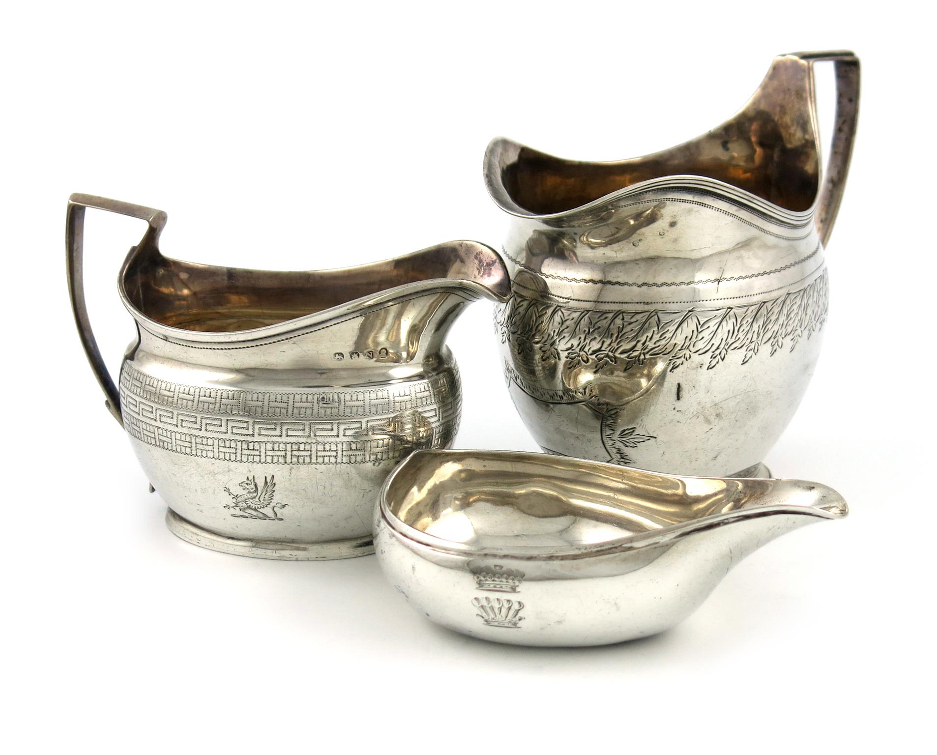 comprising: a cream jug Urquhart and Hart, London 1800, oval form, engraved decoration, plus another George III cream jug, London 1808, and a pap boat, plain oval form, London 1781, approx. weight 11oz. (3)