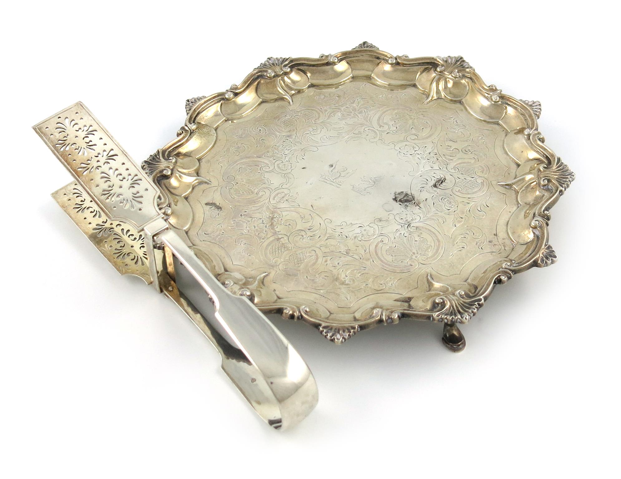 pierced blades, length 22.5cm, plus a George III salver with later decoration, shell and scroll border, on three hoof feet, diameter 25.3cm, approx. total weight 20oz. (2)