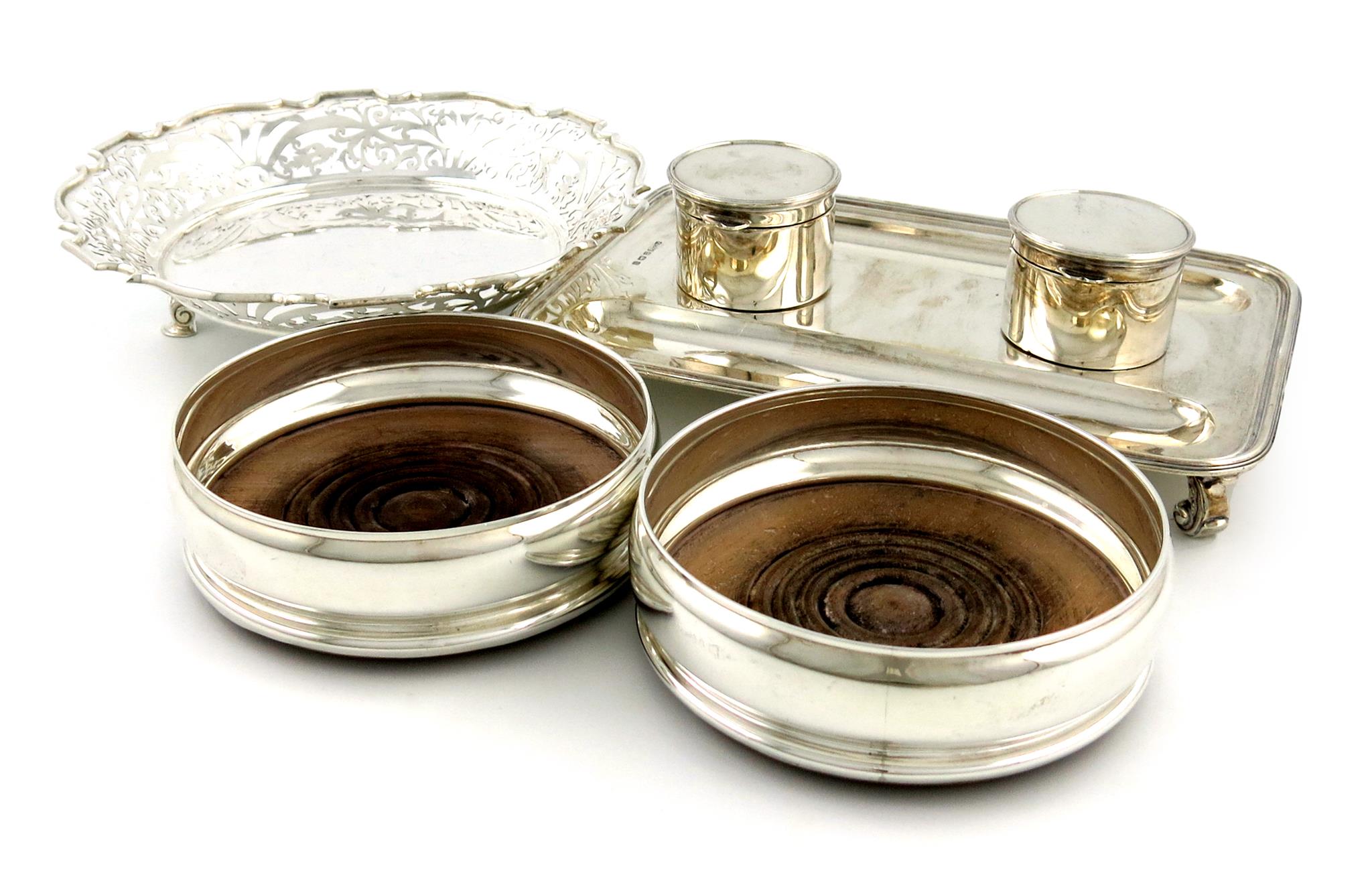 comprising: an inkwell, by Asprey and Co, Birmingham 1932, rectangular form, moulded border, with two inkwells and two pen wells, lacking glass liners, plus a pierced circular dish and a pair of modern wine coasters, London 1971, approx. weight 27oz. (4)