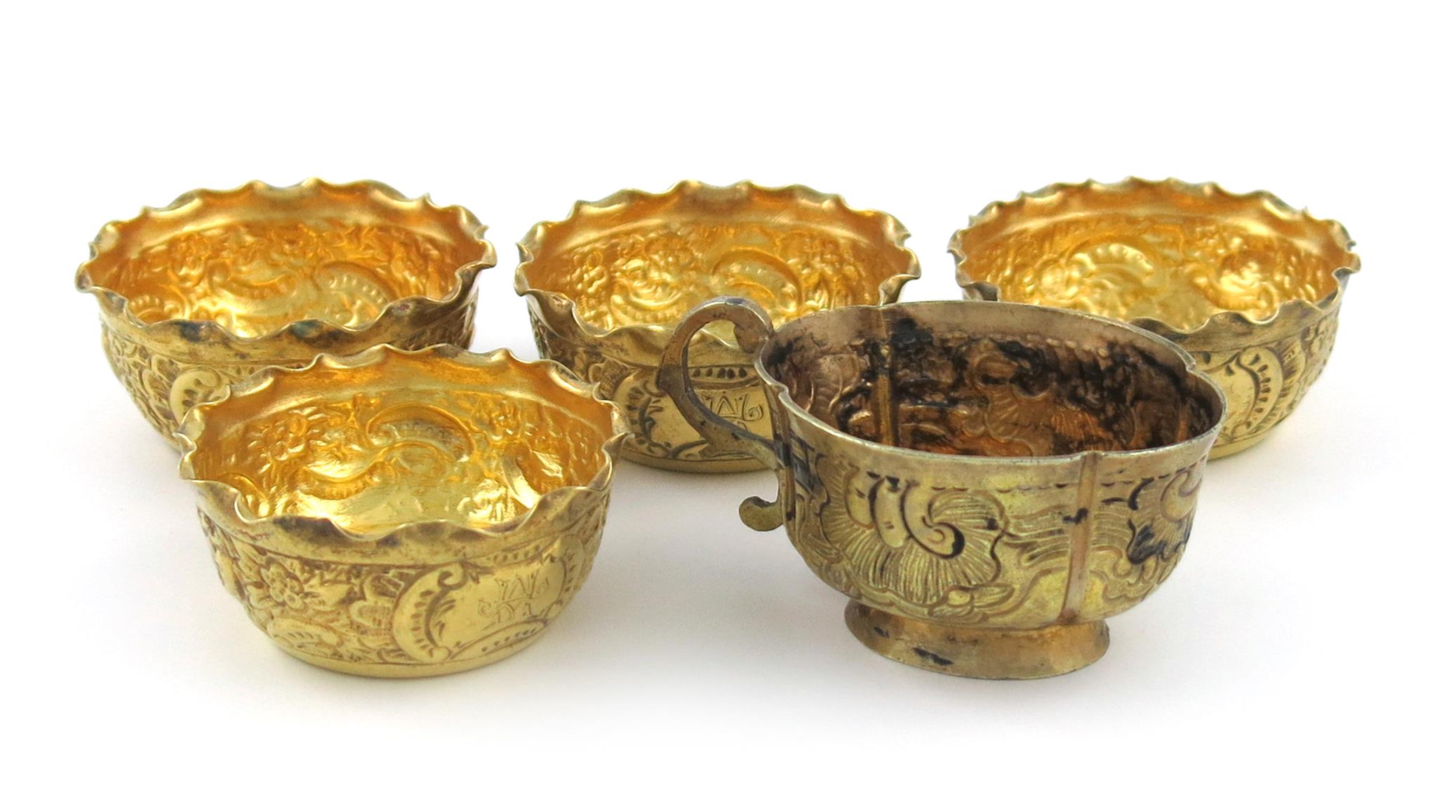 lobed oval form, chased shell decoration, scroll handle, on a raised oval foot, length 7cm, plus a set of four Victorian silver-gilt salt cellars, Birmingham 1892, approx. weight 4.3oz. (5)