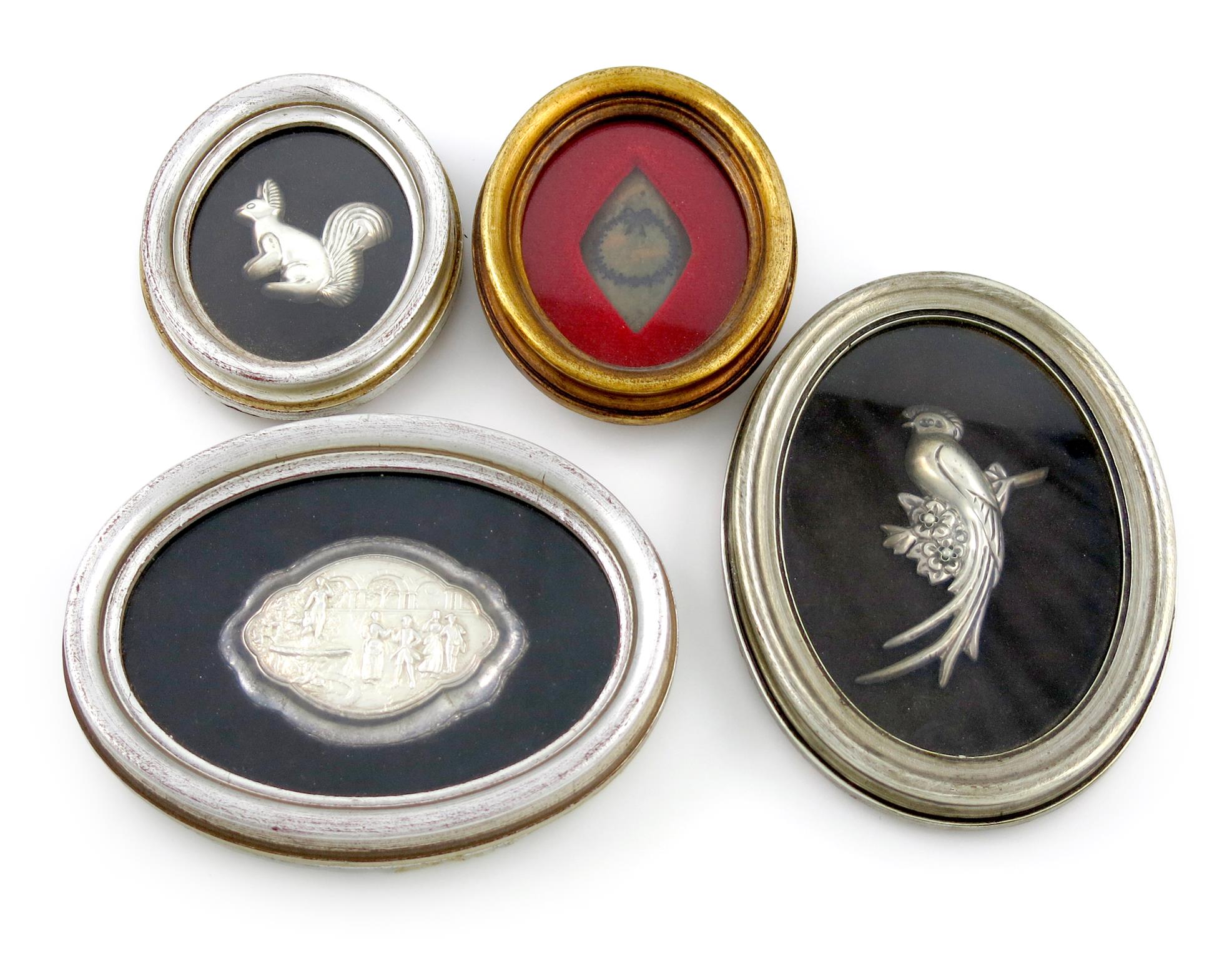 ‡A mixed lot, comprising: a framed silver snuff box lid, with figural decoration, a framed white metal bird and squirrel and a framed tortoiseshell panel inlaid with silver decoration. (4)