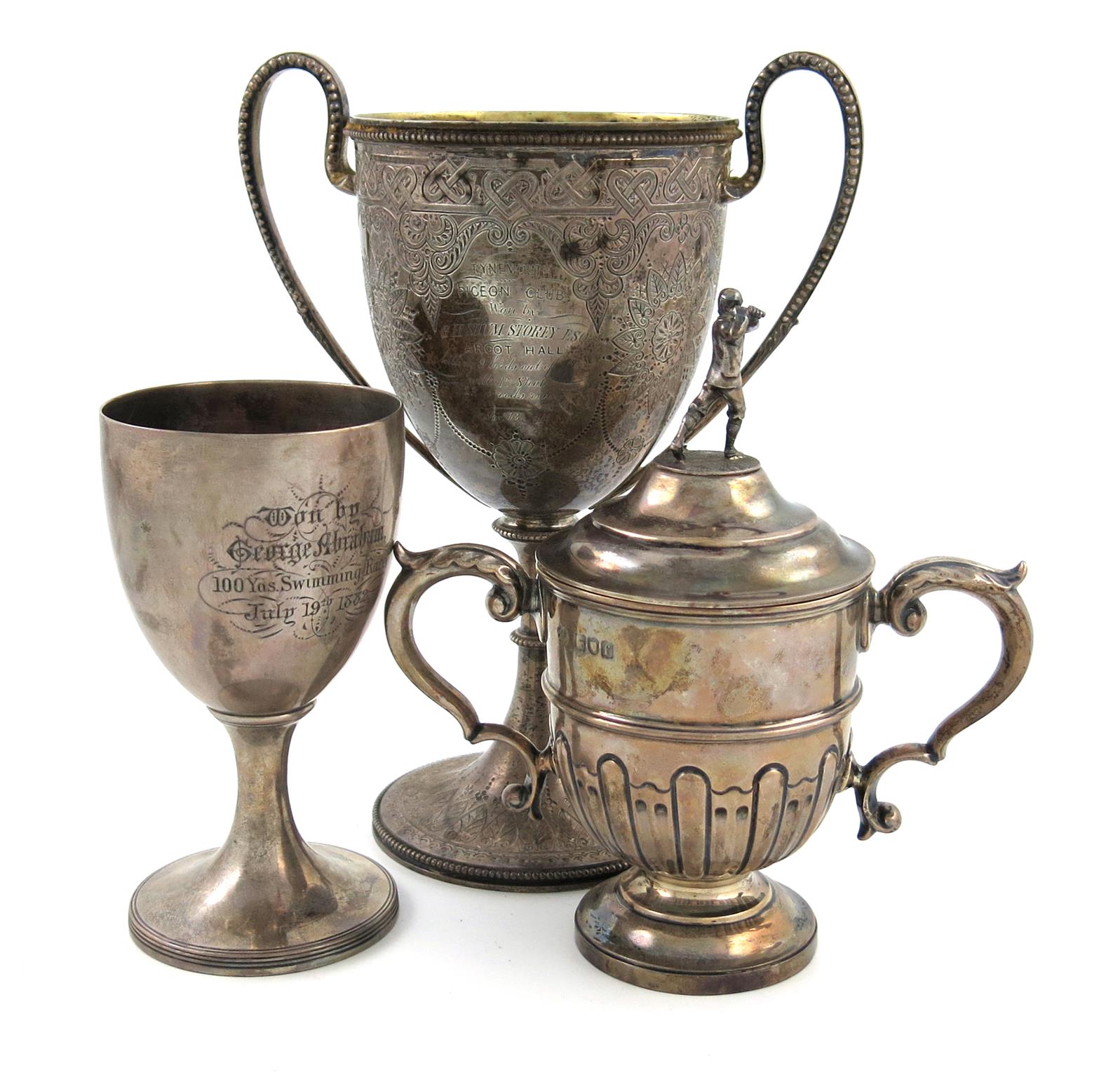 comprising: a Victorian two-handled cup, by The Barnards, London 1868, urn form, engraved decoration, with a presentation inscription relating to Tynemouth Pigeon Club, plus an Edwardian trophy cup, by William Hutton and Sons, London 1901, with a golfer finial, and a trophy goblet, by Peter and William Bateman, London 1809, with a later inscription, approx. total weight 30oz. (3)