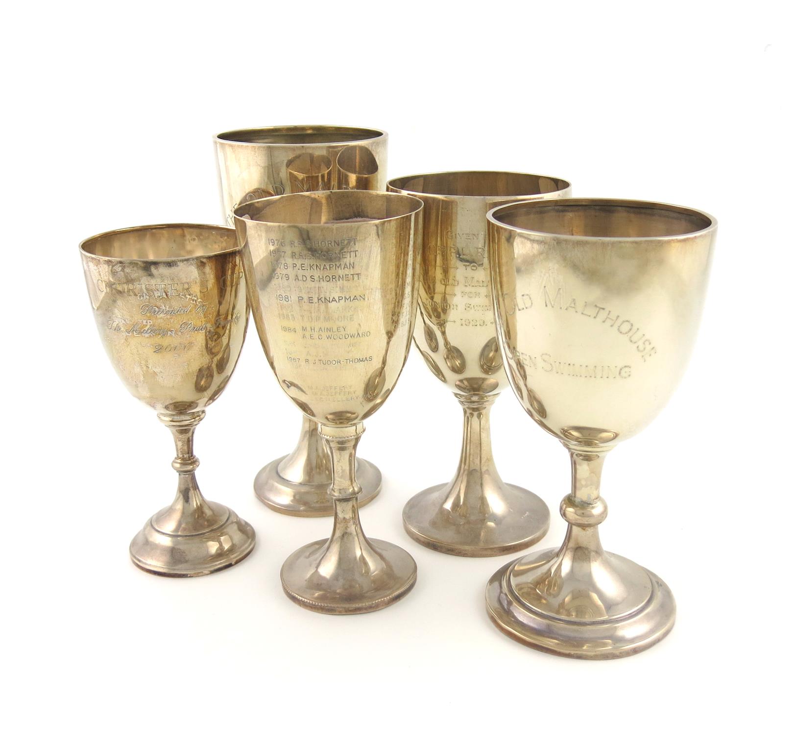 A collection of five silver trophy goblets, various dates and makers, urn form, on knopped stems on raised circular bases, approx. weight 35.7oz. (5)