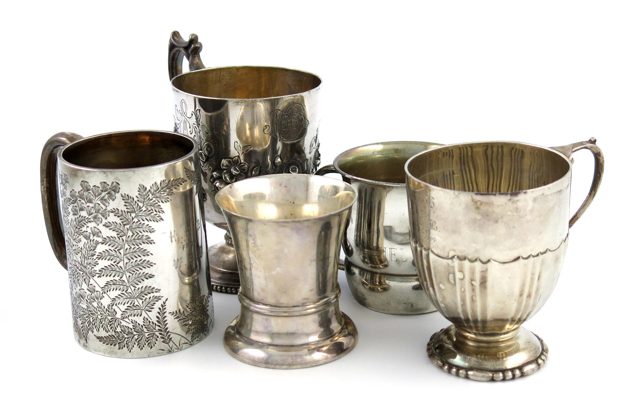 comprising: a Victorian one by Joseph Angell, London 1856, circular form, embossed foliate decoration, initialled, plus a Victorian one with fern decoration, London 1887, another mug, London 1913, and an American one, plus a beaker, by Charles Edwards, London 1911, approx. weight 21oz. (5)
