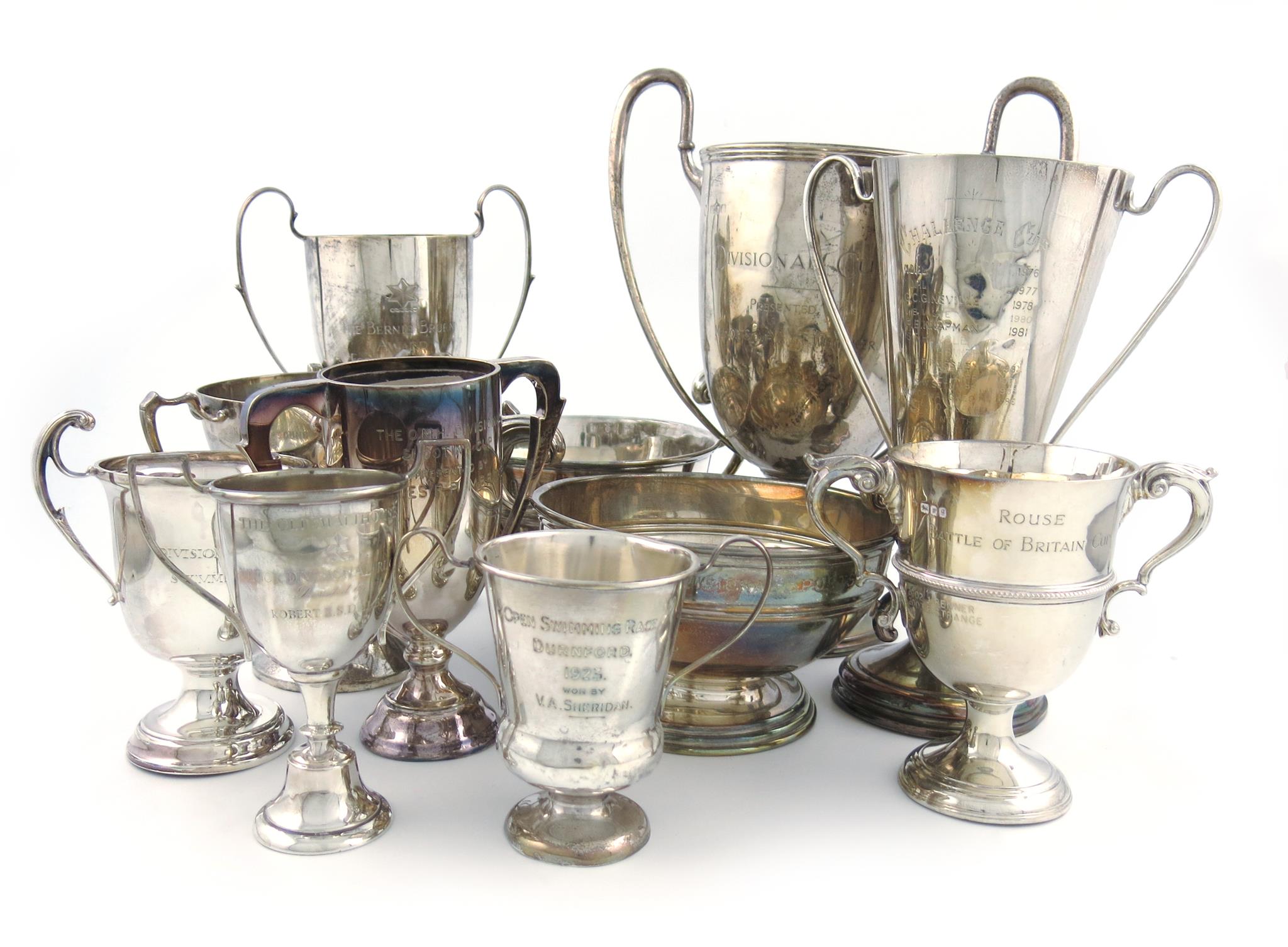 A mixed lot of silver trophy cups, various dates and makers, including one by Charles and George Asprey, one by The Barnards, London 1922, and various others, all inscribed, approx. weight 107oz. (qty)