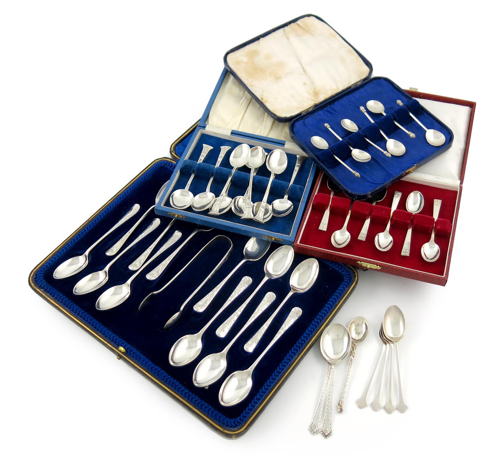 A mixed lot of silver flatware, comprising: a set of twelve teaspoons and tongs, by J. Rodgers, Sheffield 1910, in a fitted case, plus nine cased teaspoons, two cased sets of six coffee spoons and seven teaspoons, approx. weight 14oz. (qty)