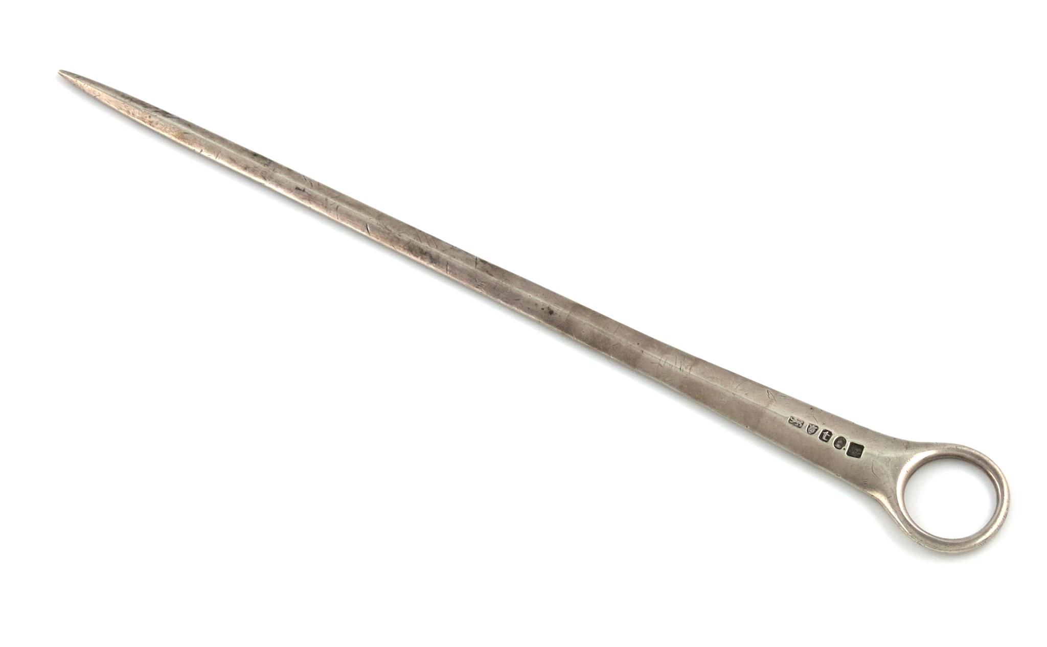 A George III silver meat skewer, by Northcote and Bourne, London 1794, plain ring terminal, engraved with a crest, length 30cm, approx. weight 2.7oz.