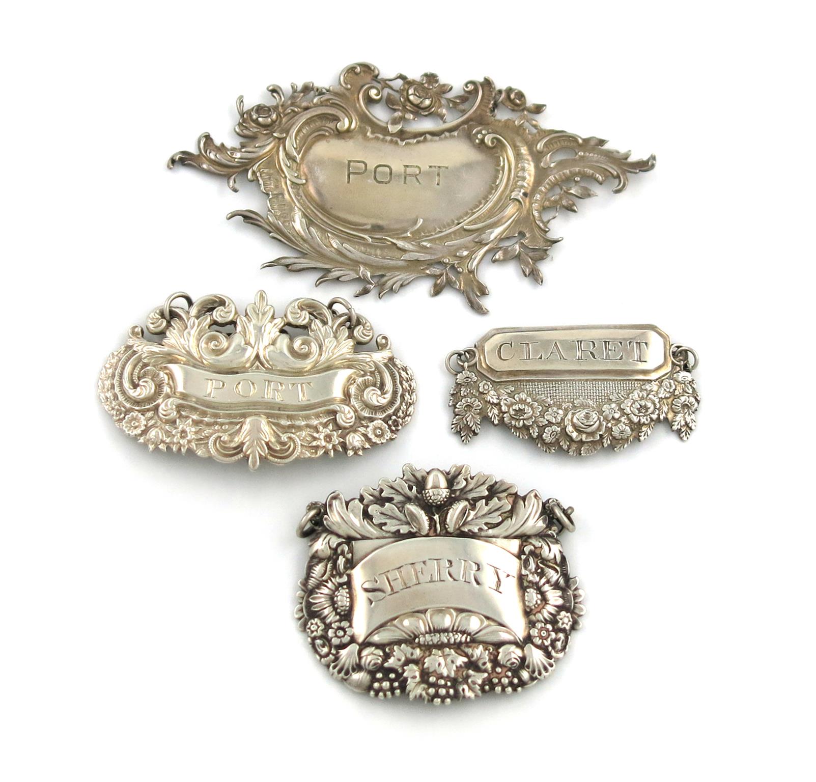 comprising: one of pierced foliate scroll form, with import marks for 1896, incised 'PORT', plus others 'CLARET', 'SHERRY' and 'PORT', approx. weight 2oz. (4)