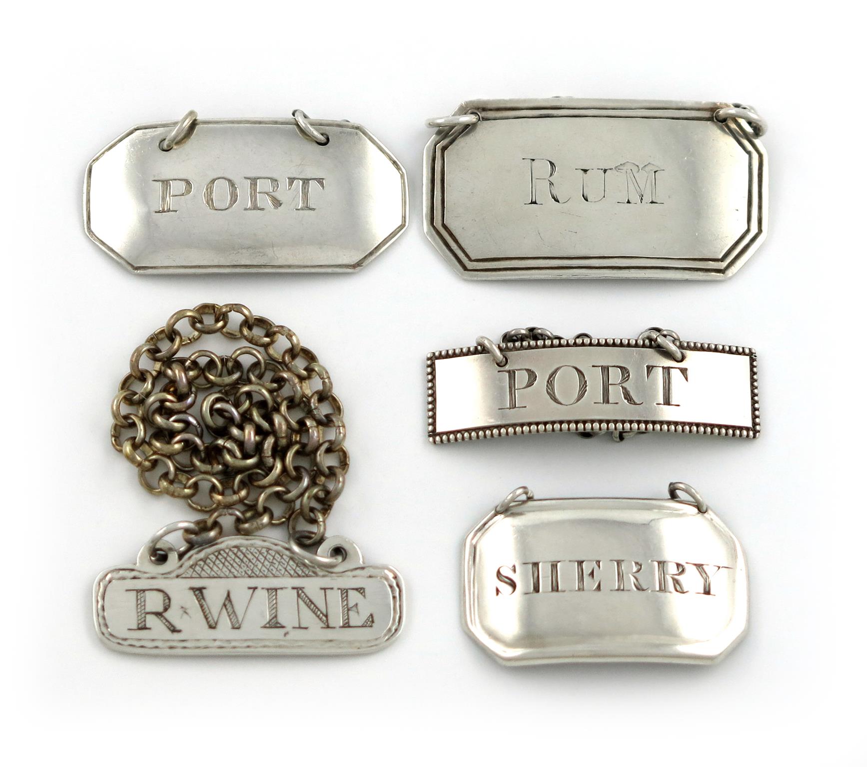 comprising: one by William Hope, Exeter 1828, rectangular form, canted corners, incised 'PORT', plus one by William Woodman, Bristol circa 1840, incised 'SHERRY', plus one by J and J Williams, Exeter 1865, incised 'R.WINE', another by the same maker, Exeter 1870, incised 'RUM', and one by Thomas Howell of Bath, circa 1790, incised 'PORT', approx. weight 1.9oz. (5)